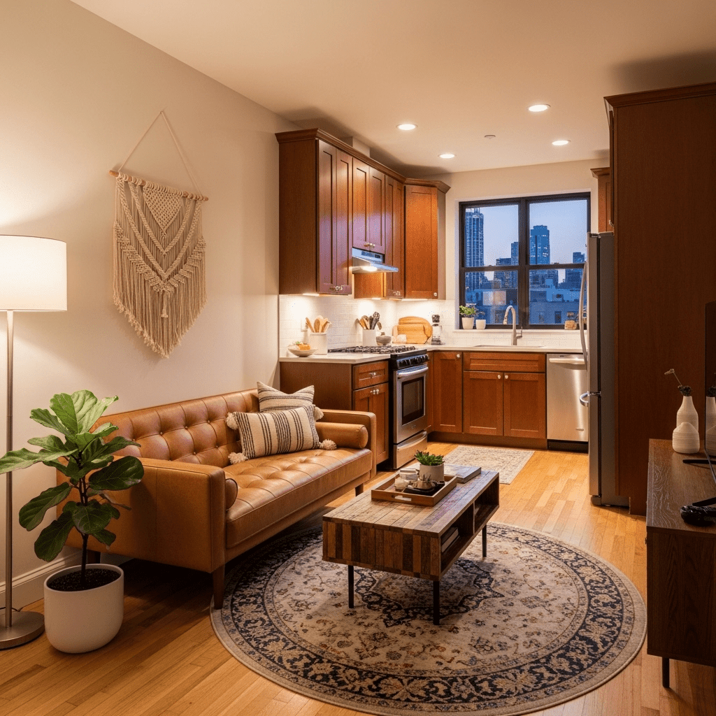 Place a large, high-texture rug in the living area while leaving the kitchen floor bare. This “islands” the living room, giving it a distinct identity within the open room.
