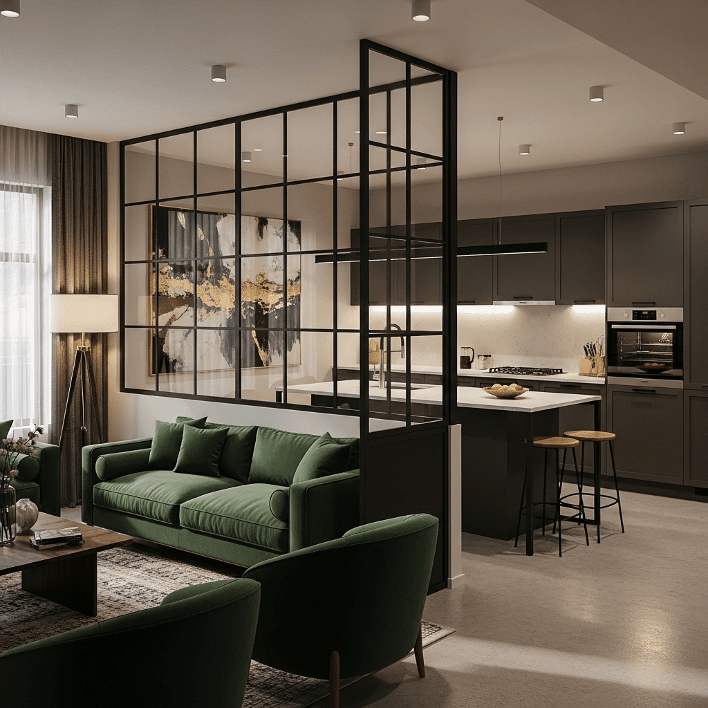 Position the back of your sofa directly against the edge of the kitchen zone. This clear visual wall tells the eye exactly where the kitchen ends and the relaxation area begins.