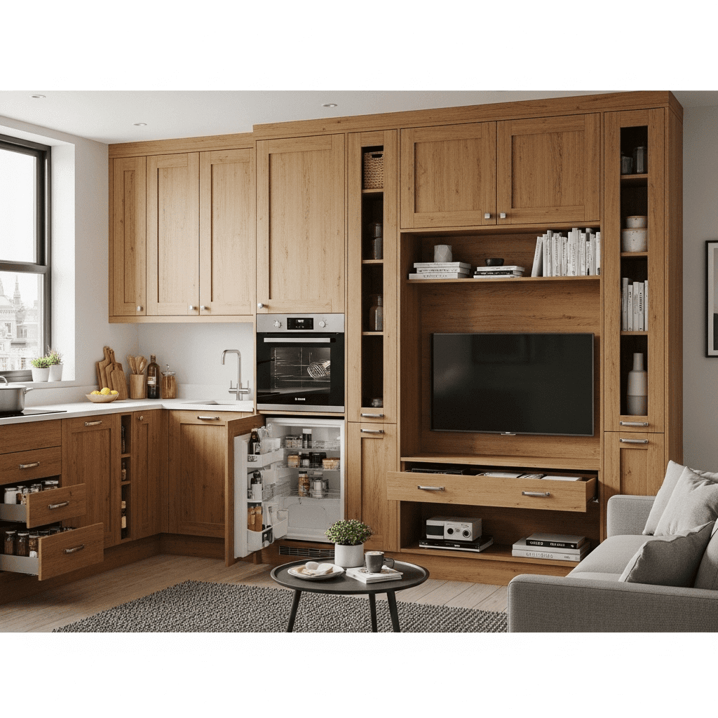 Create one continuous wall of cabinetry that transitions from kitchen pantry storage to a living room media unit for a clean, uninterrupted look.