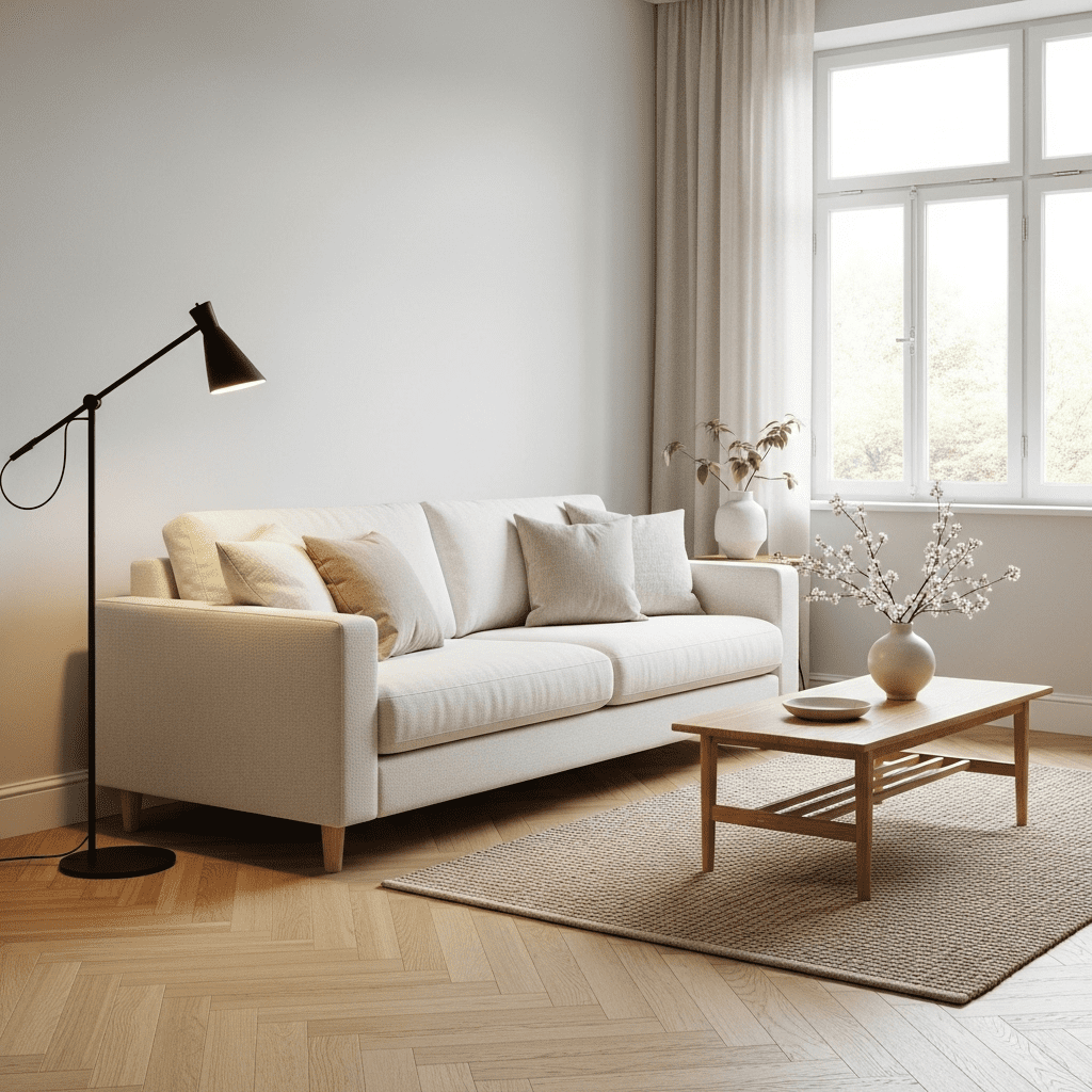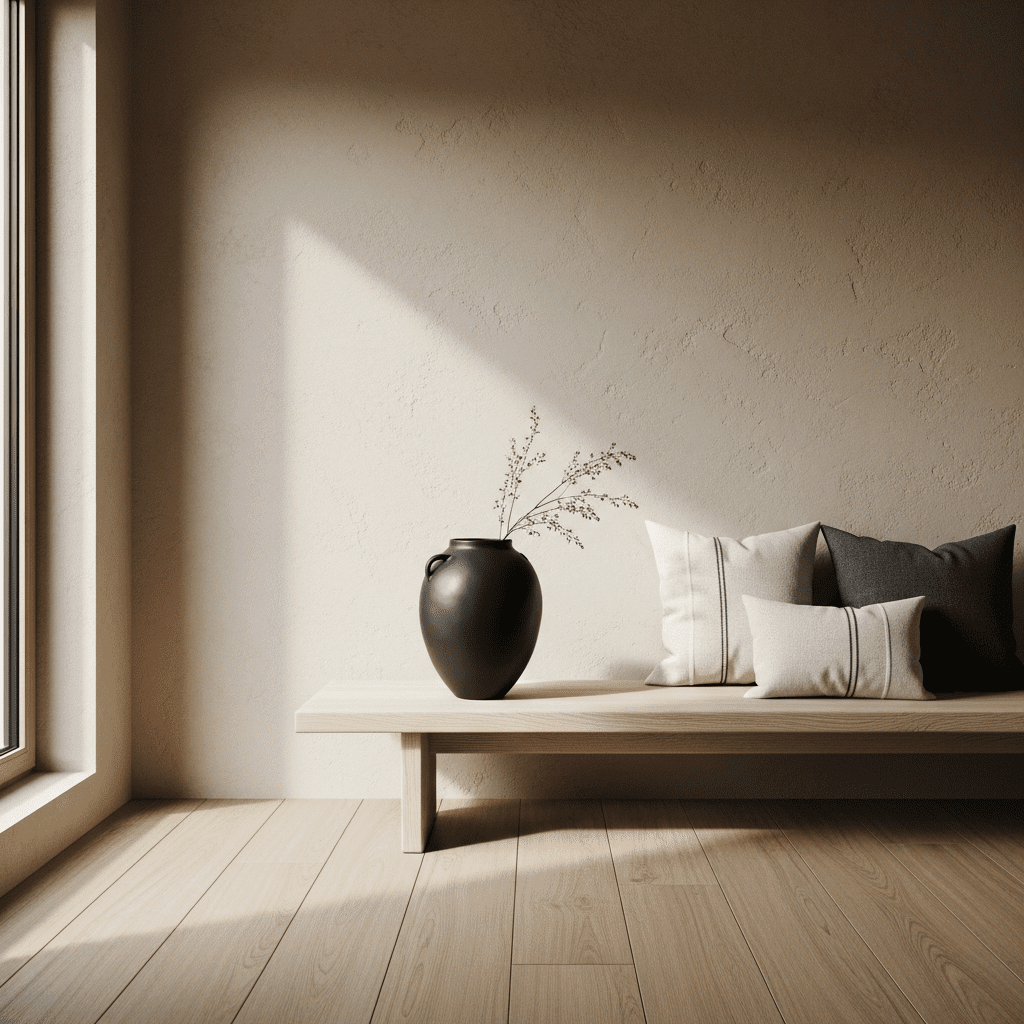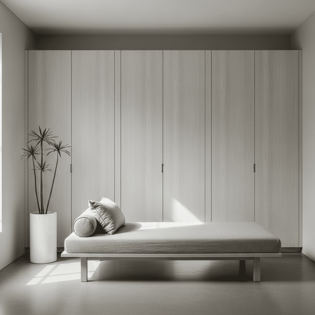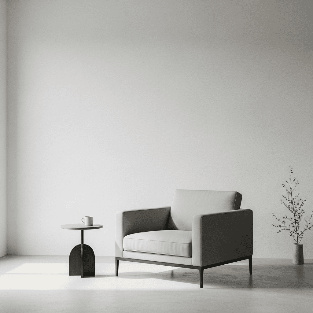 A layout that intentionally leaves large areas of the wall and floor empty, allowing the few chosen furniture pieces to “breathe.”