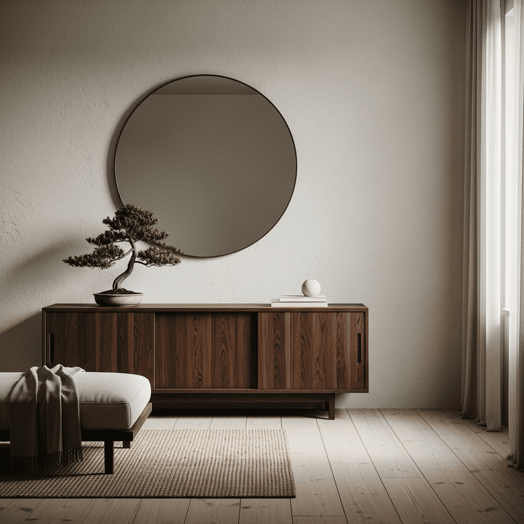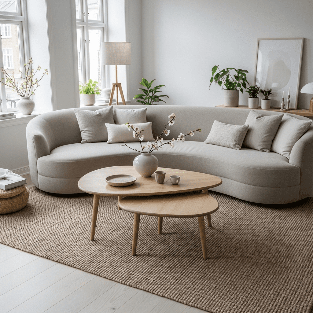 Infusing the “Scandinavian” side with sharp black accents—like window frames, thin table legs, or hardware—to ground the light wood and beige tones.
