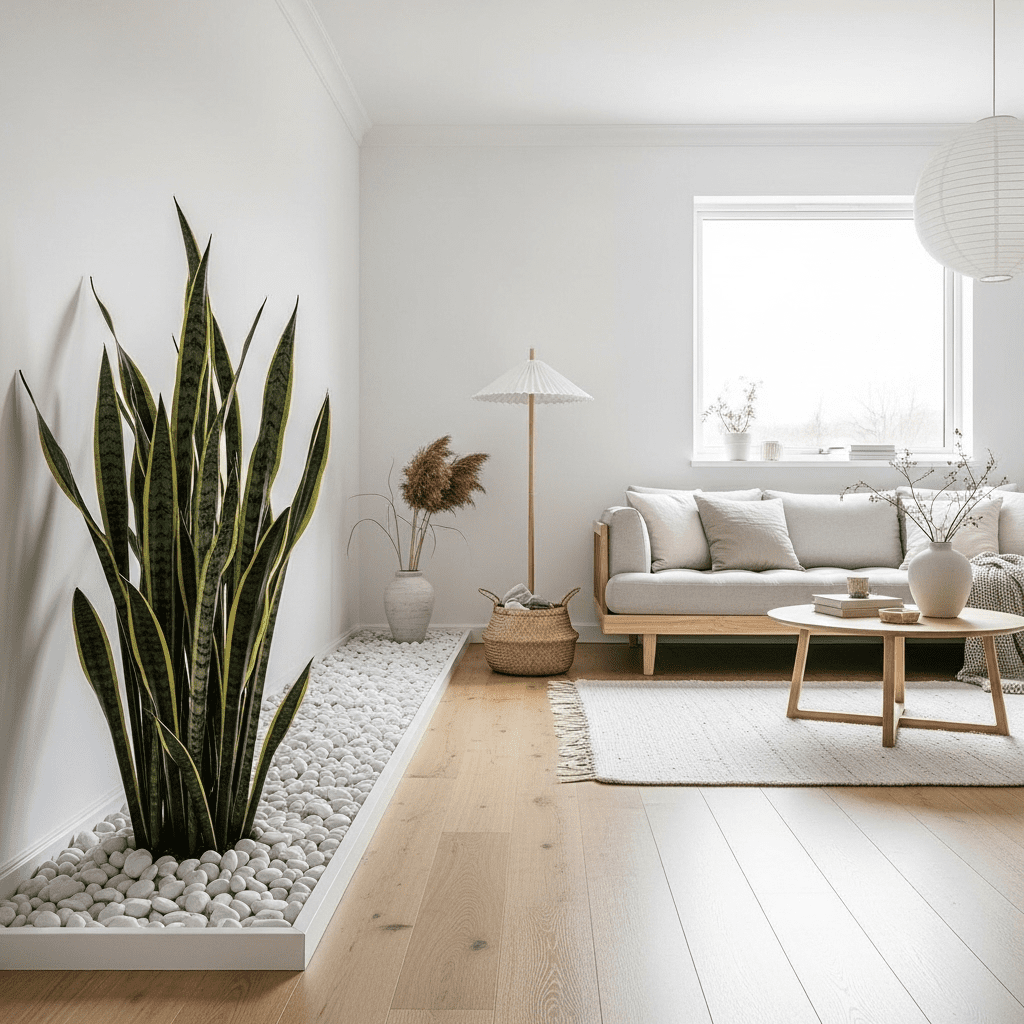 Integrating a small interior “dry garden” with smooth river stones and a single plant at the edge of the living room floor.