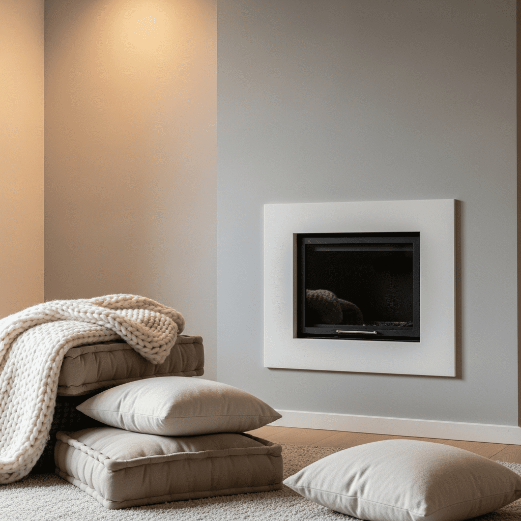 A minimalist fireplace design without a mantel, surrounded by floor cushions and a thick, hand-knit throw for maximum coziness.