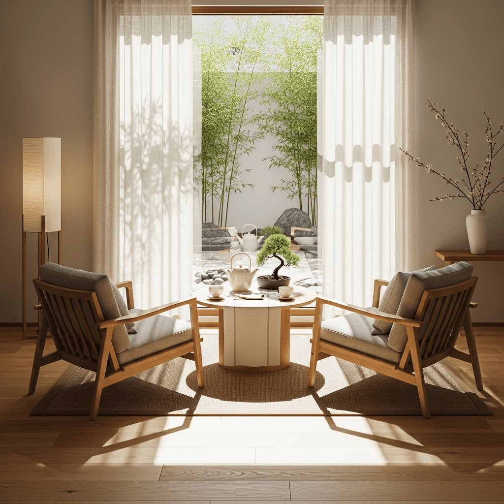 A dedicated corner with two low chairs and a simple wooden table positioned near a large window to celebrate the ritual of tea.
