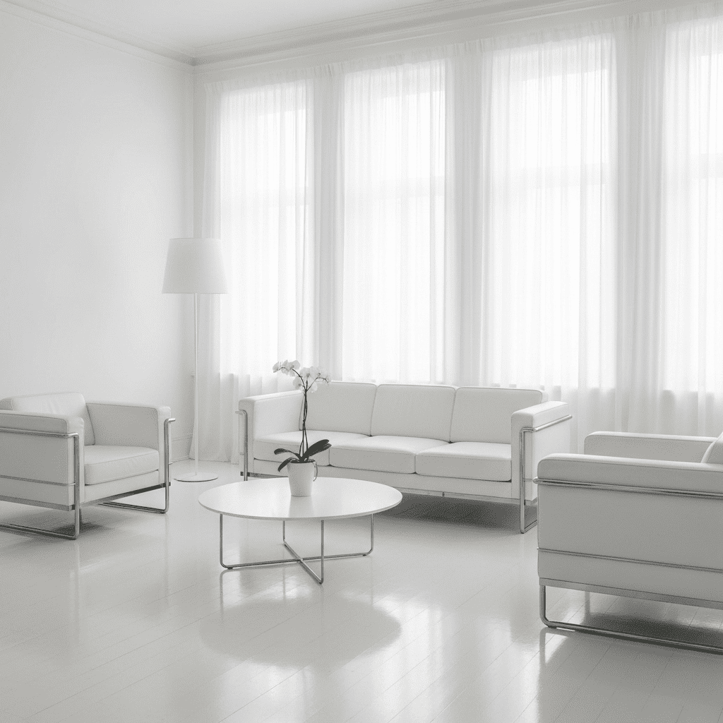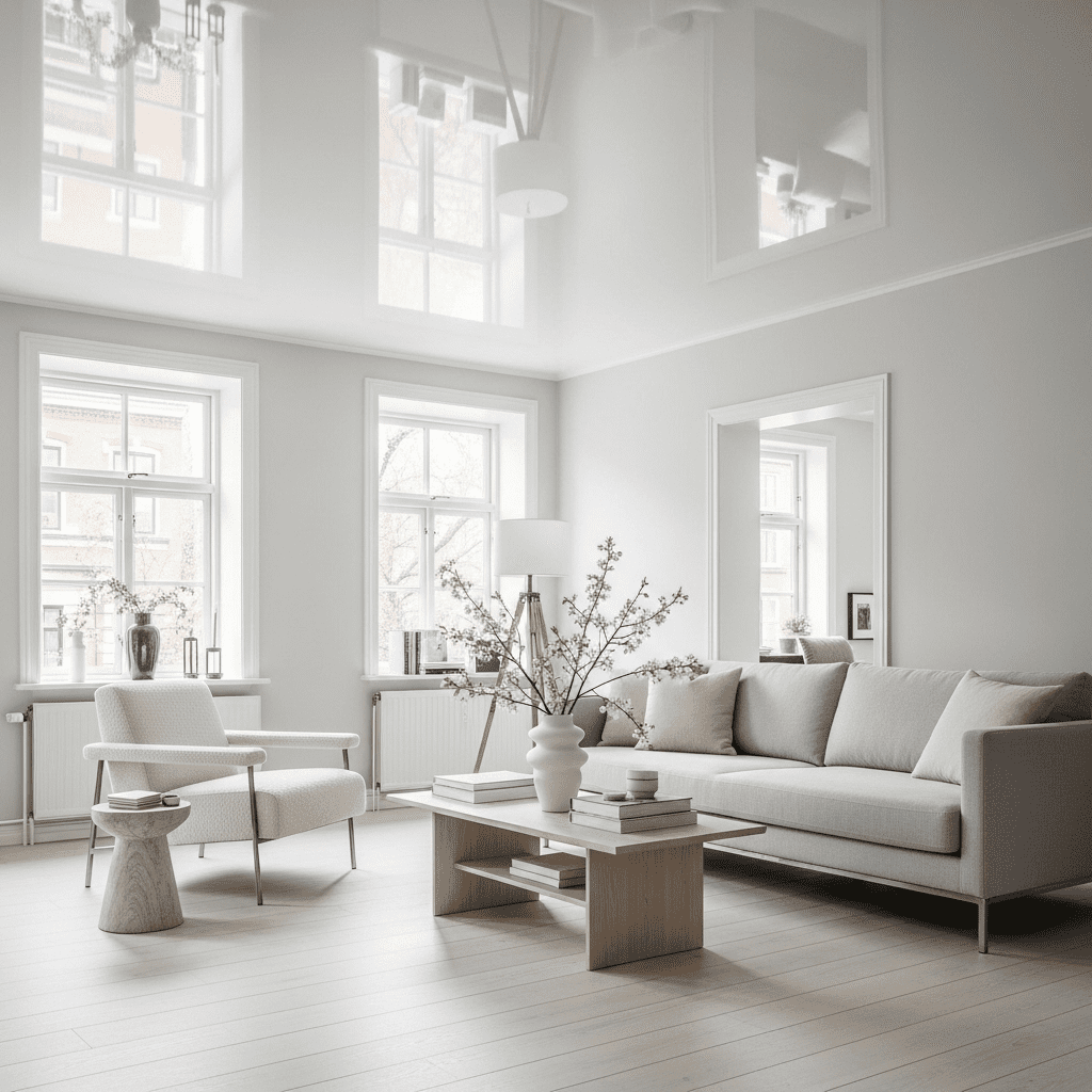 A high-gloss, ultra-clean look where everything from the walls to the floors and furniture is a bright, reflective white.