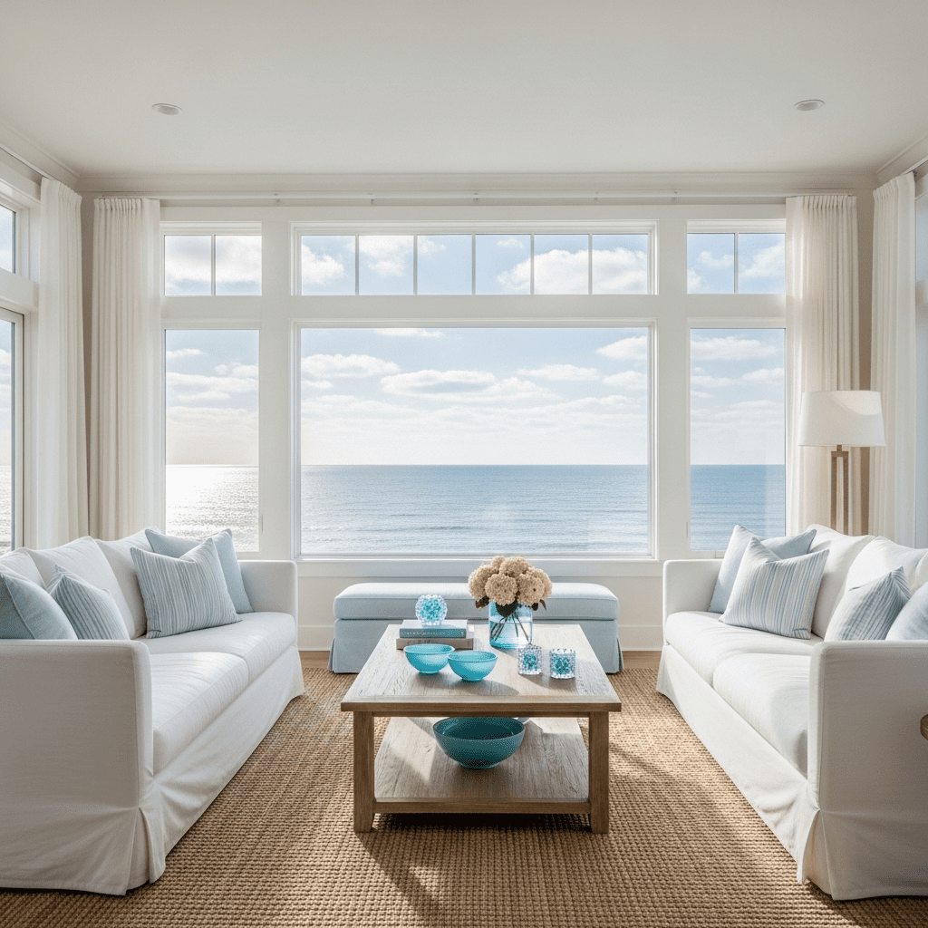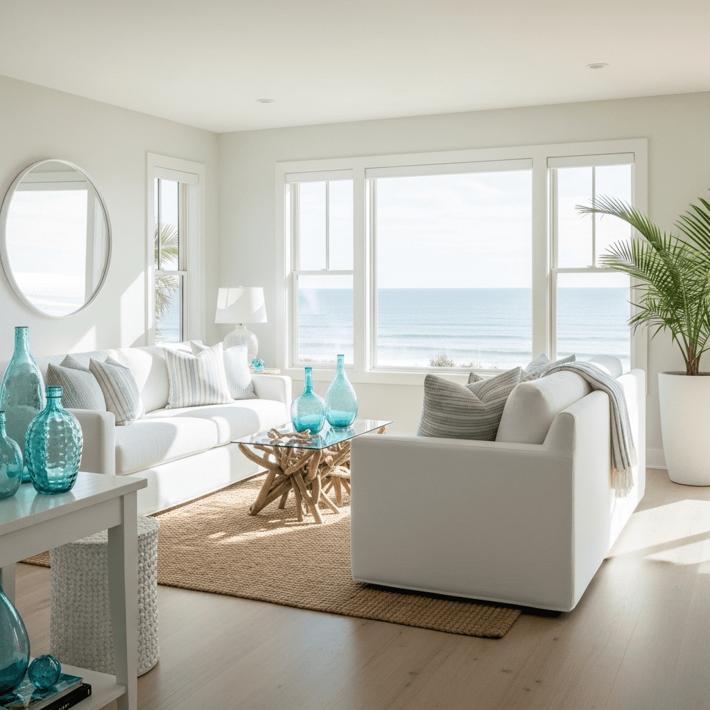 Using a foundation of white and cream accented by very soft, desaturated sky blues and seafoam greens to mimic a beachside atmosphere.