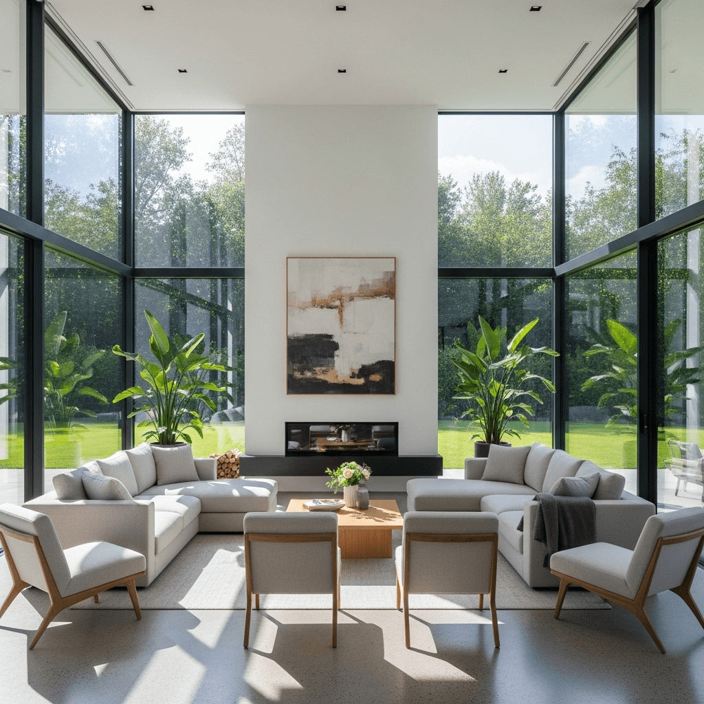 A room where at least two walls are replaced by floor-to-ceiling glass, blurring the lines between the indoors and the bright outdoors.