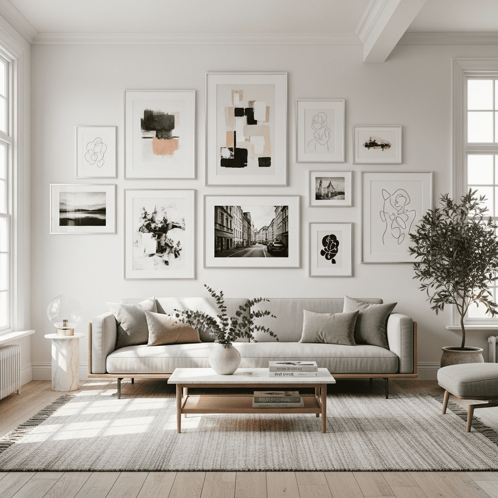 Displaying art in thin, white, or silver frames with large white mats to keep wall decor from feeling “heavy” or dark.