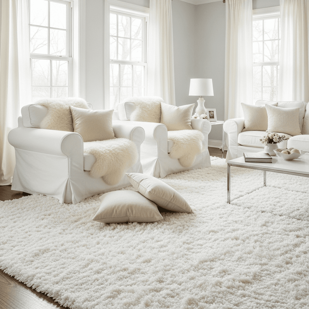 A focus on high-pile white rugs, sheepskin throws, and fluffy pillows to make a bright room feel cozy and soft rather than sterile.
