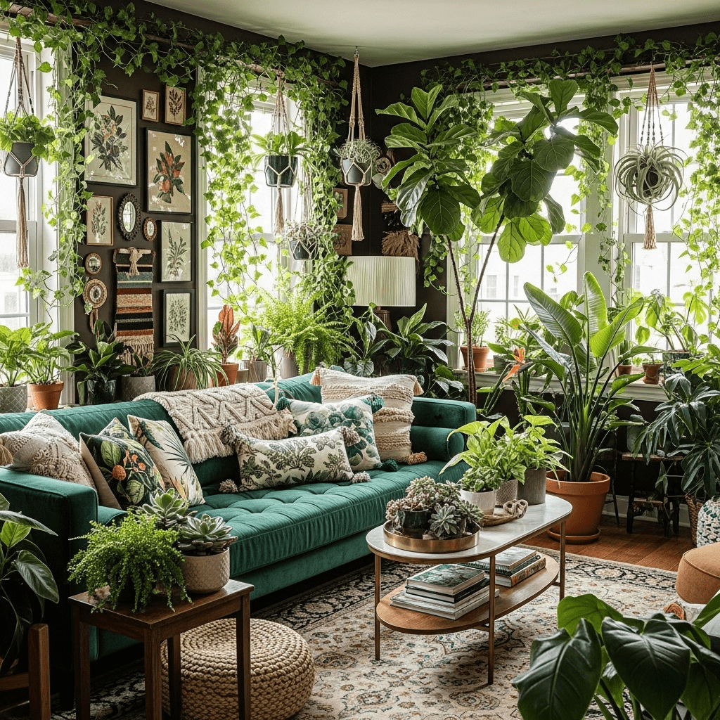 A room overflowing with life, where every available surface is covered in greenery. It uses various heights—from floor pots to ceiling hooks—to create a fully immersive botanical experience.