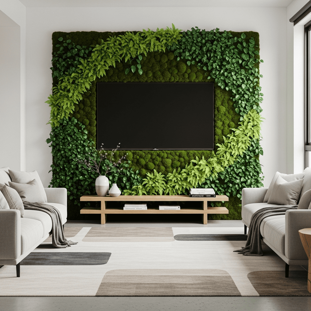 Integrating a vertical garden or “moss wall” directly around the TV or fireplace. This turns the entertainment hub into a lush, organic focal point.