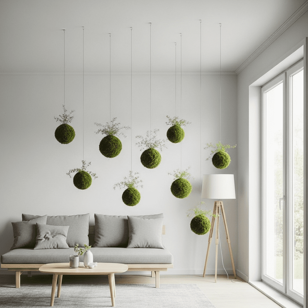 Japanese “moss balls” (kokedama) suspended at different levels from the ceiling. This creates a floating garden that doesn’t take up any floor space.