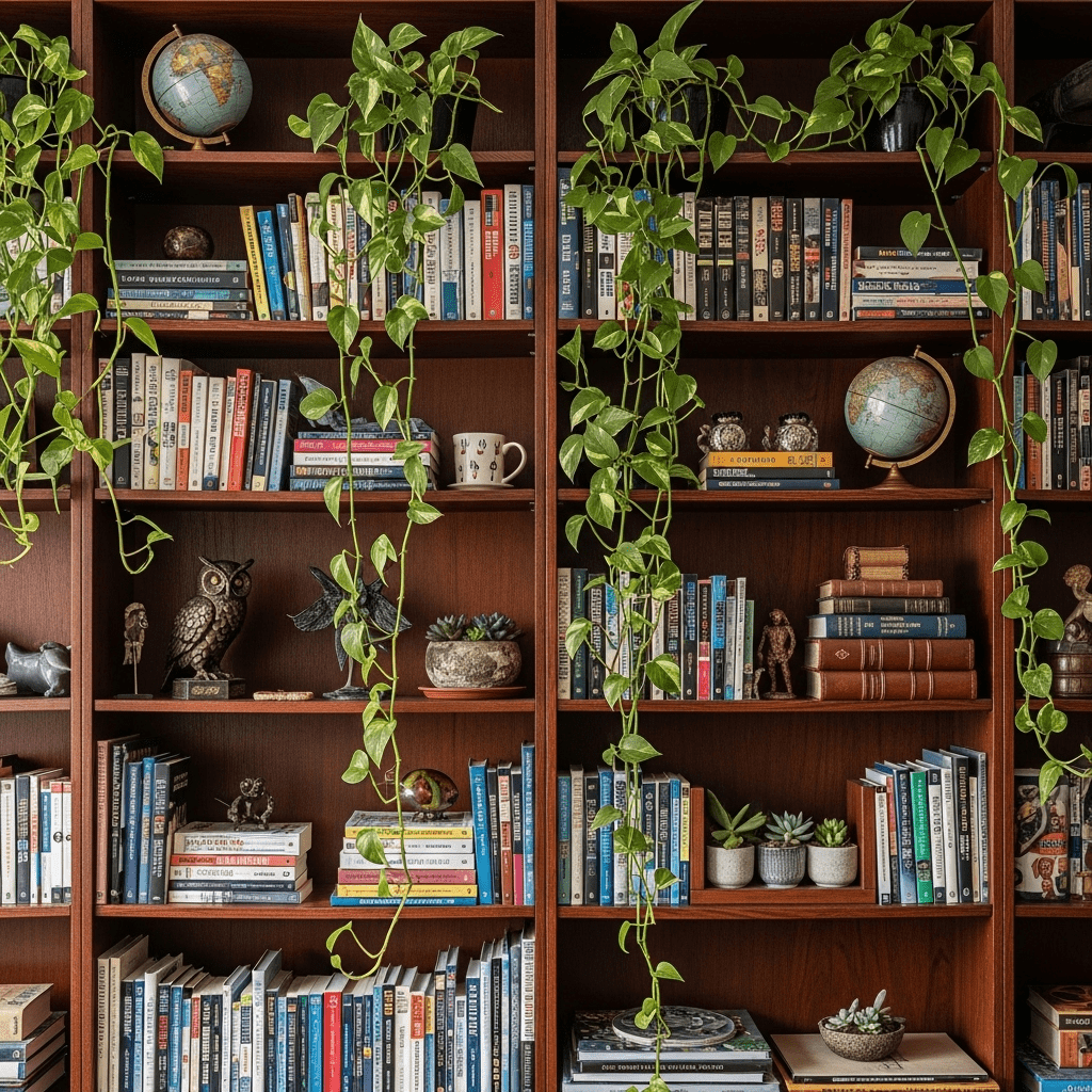 Placing “string of pearls” or pothos on high bookshelves so the vines can spill down like a green waterfall over your books and decor.