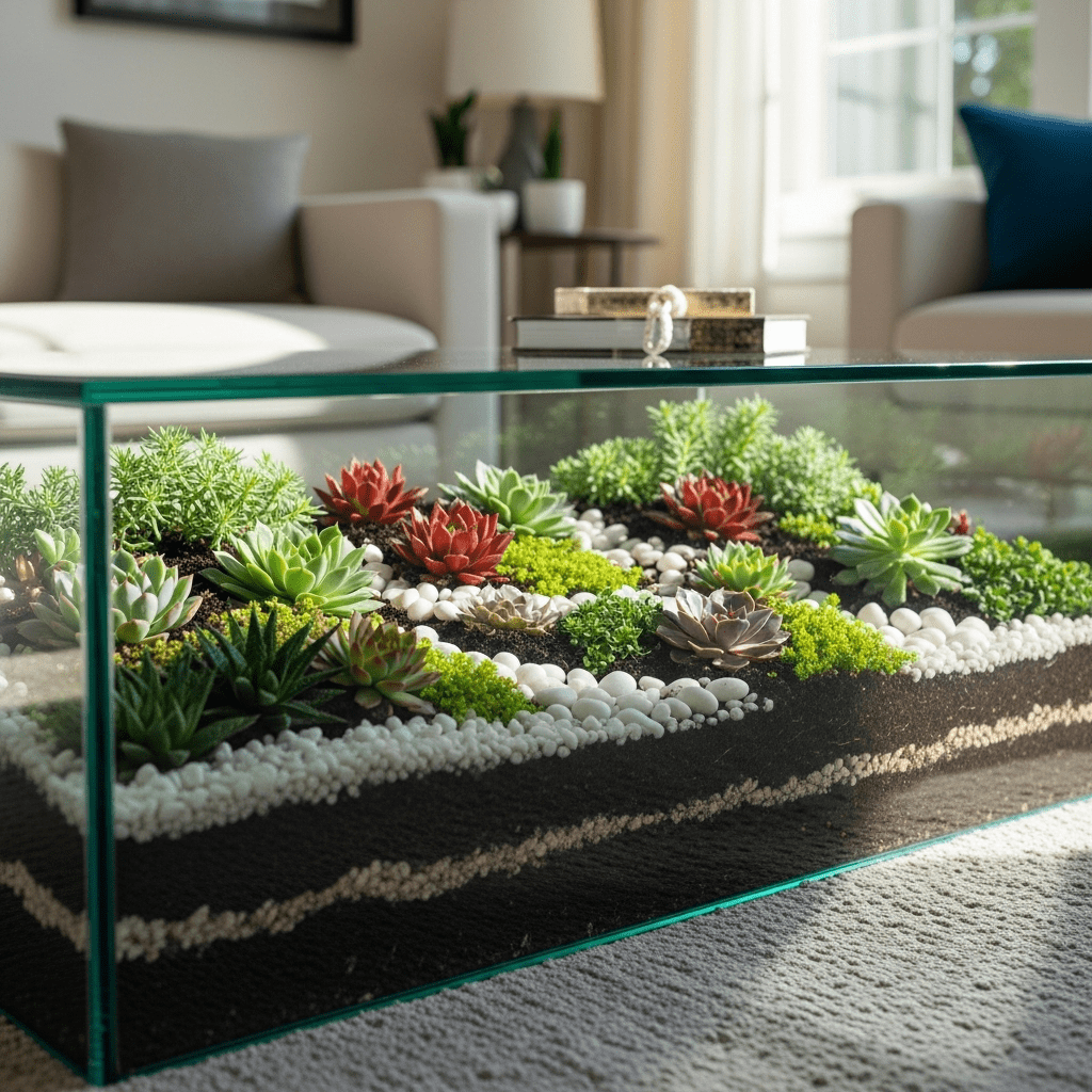 A custom coffee table with a glass top and a hollow base that houses a miniature desert or tropical ecosystem inside.