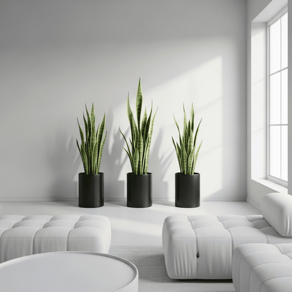 Using the sharp, vertical lines of Snake Plants (Sansevieria) in sleek black or white pots for a clean, architectural look that requires almost no maintenance.