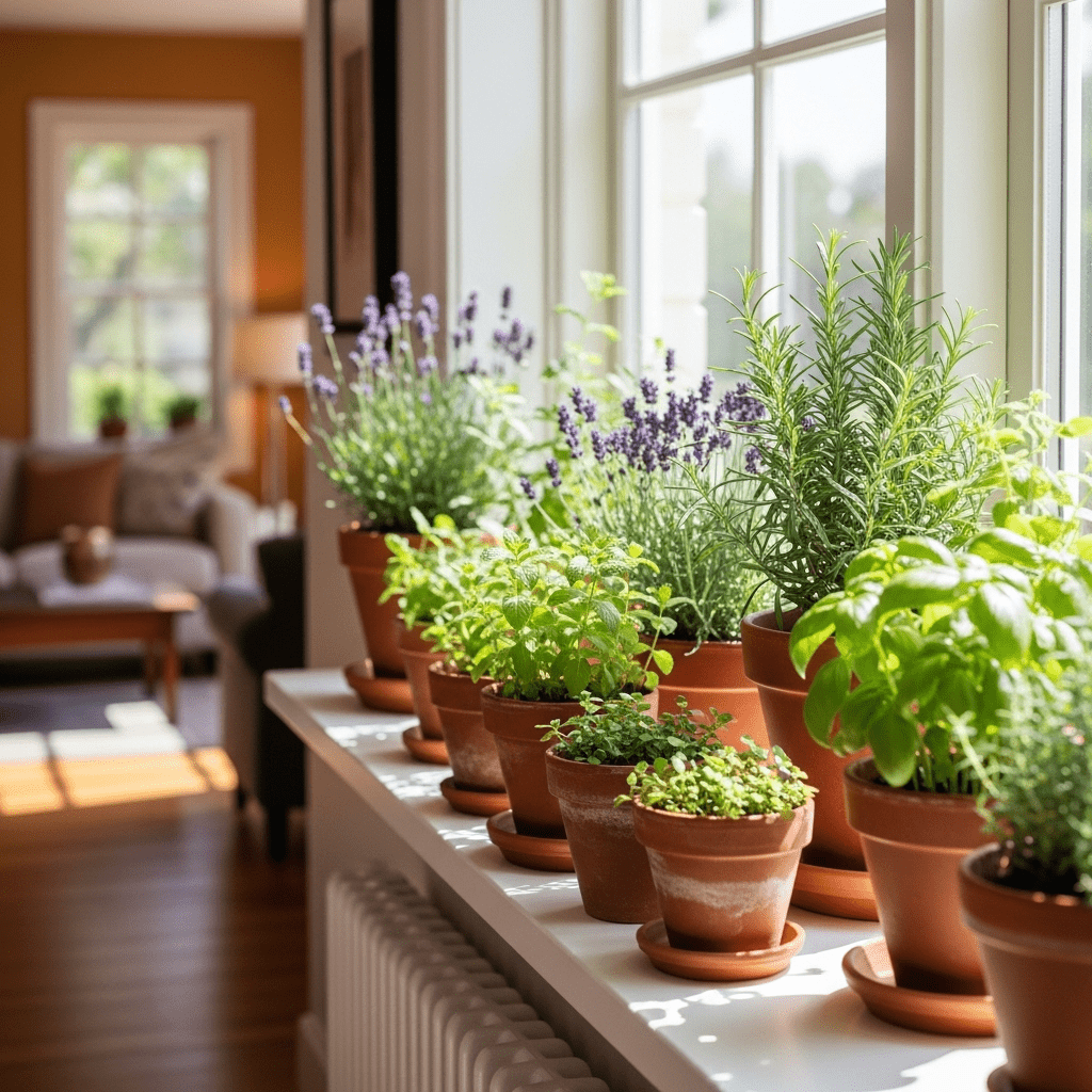 A functional and aesthetic choice where the living room window is lined with small pots of lavender, mint, and rosemary for a natural fragrance.