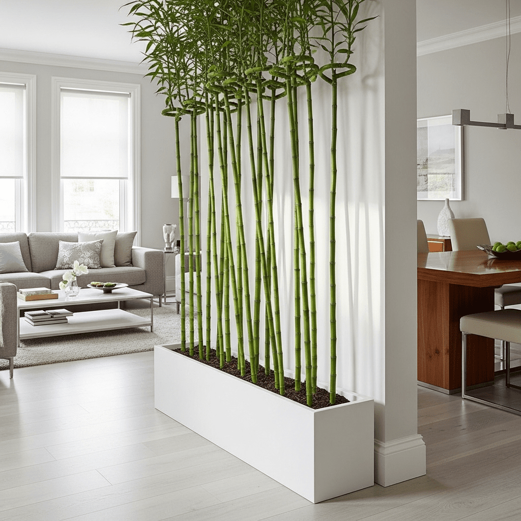 Using tall, slender bamboo stalks in a long, rectangular planter to act as a semi-transparent room divider between the lounge and dining area.