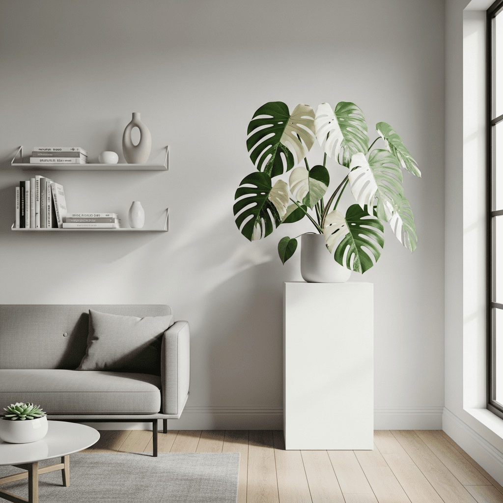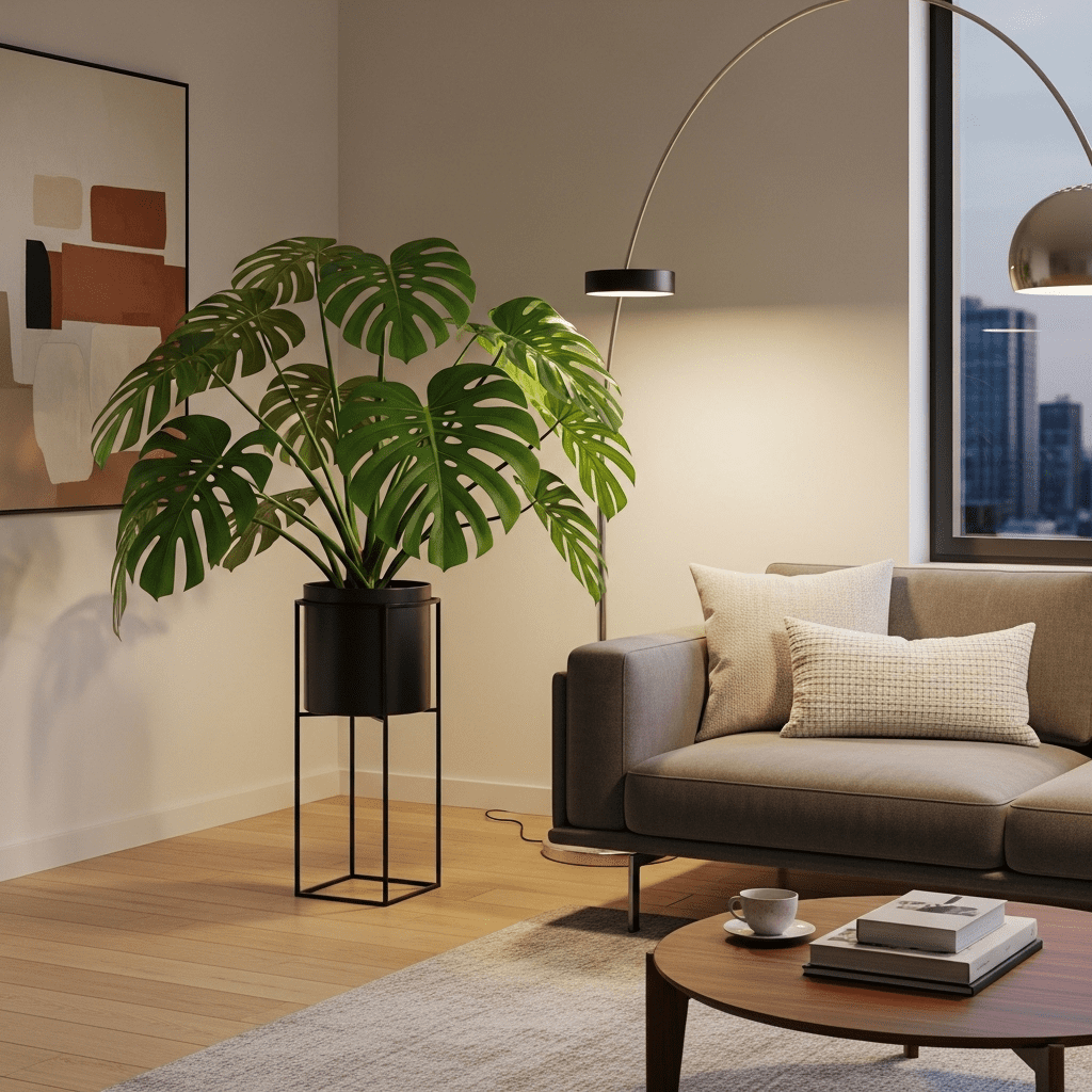 Centering the room around the iconic Swiss Cheese Plant. Its massive, hole-filled leaves add an instant tropical-luxe vibe to any space.