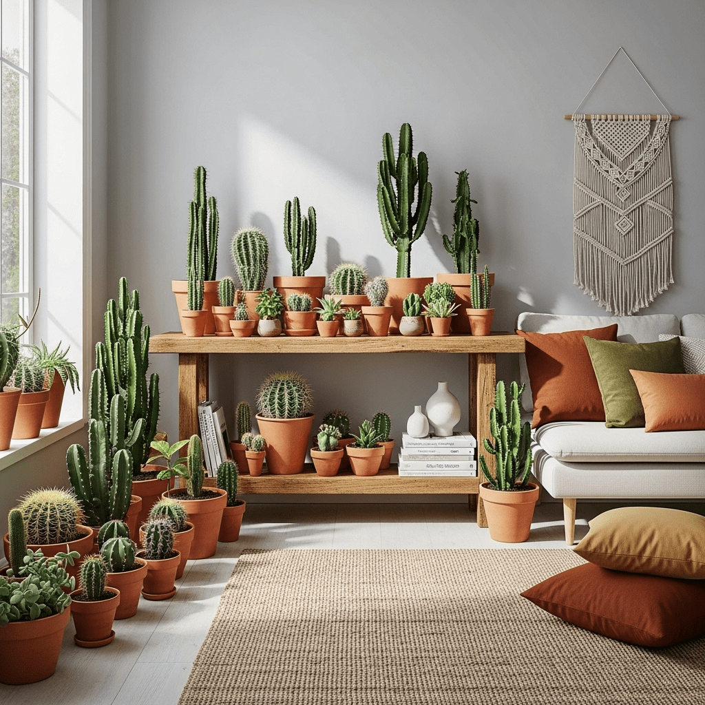A low-humidity design featuring terra cotta pots filled with various cacti and succulents on a sun-drenched console table.