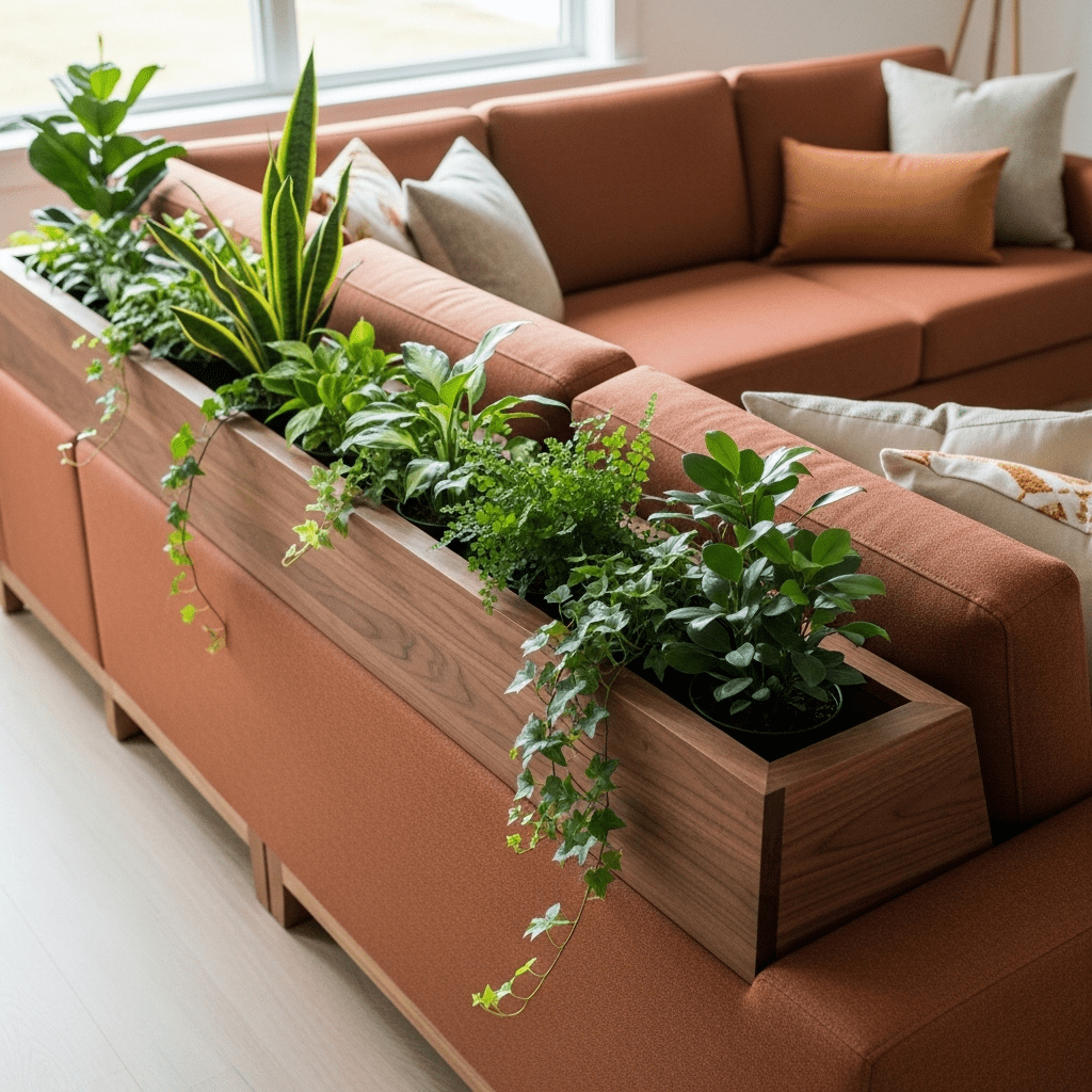 Custom furniture where the back or side of the sofa features a built-in wooden trough for plants, literally surrounding you with greenery while you sit.