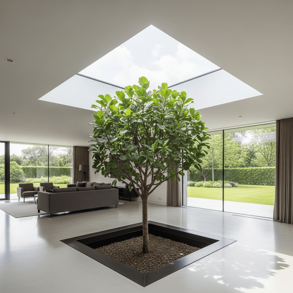 A high-end architectural choice where a small section of the floor is removed to plant a small tree directly into the ground, often under a skylight.