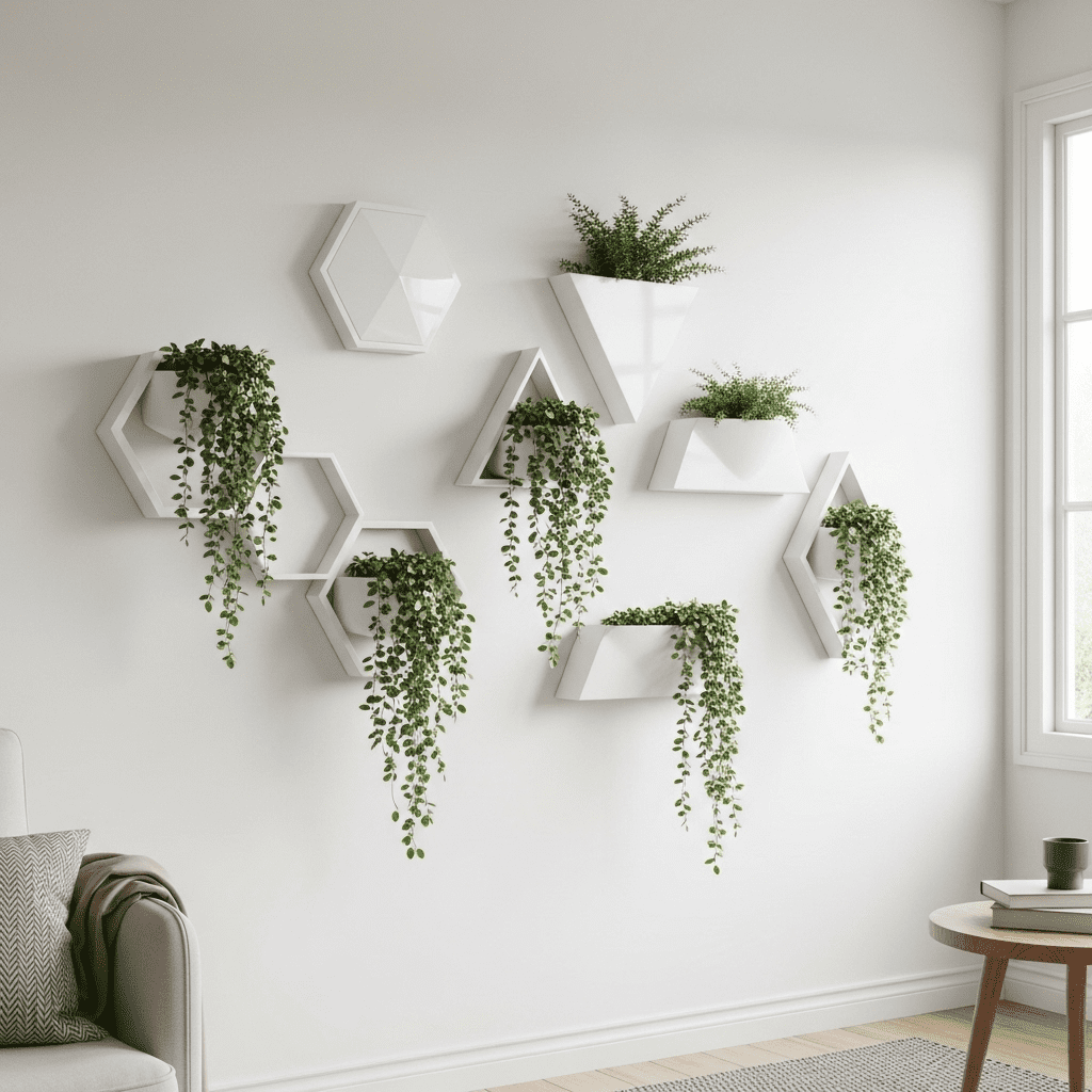 Using geometric wall-mounted “pockets” to grow small plants upward, turning a blank wall into a 3D botanical installation.