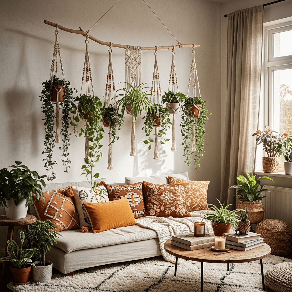 A classic 70s revival featuring hand-woven rope hangers for spider plants and ferns, adding a tactile, cozy texture to the room.