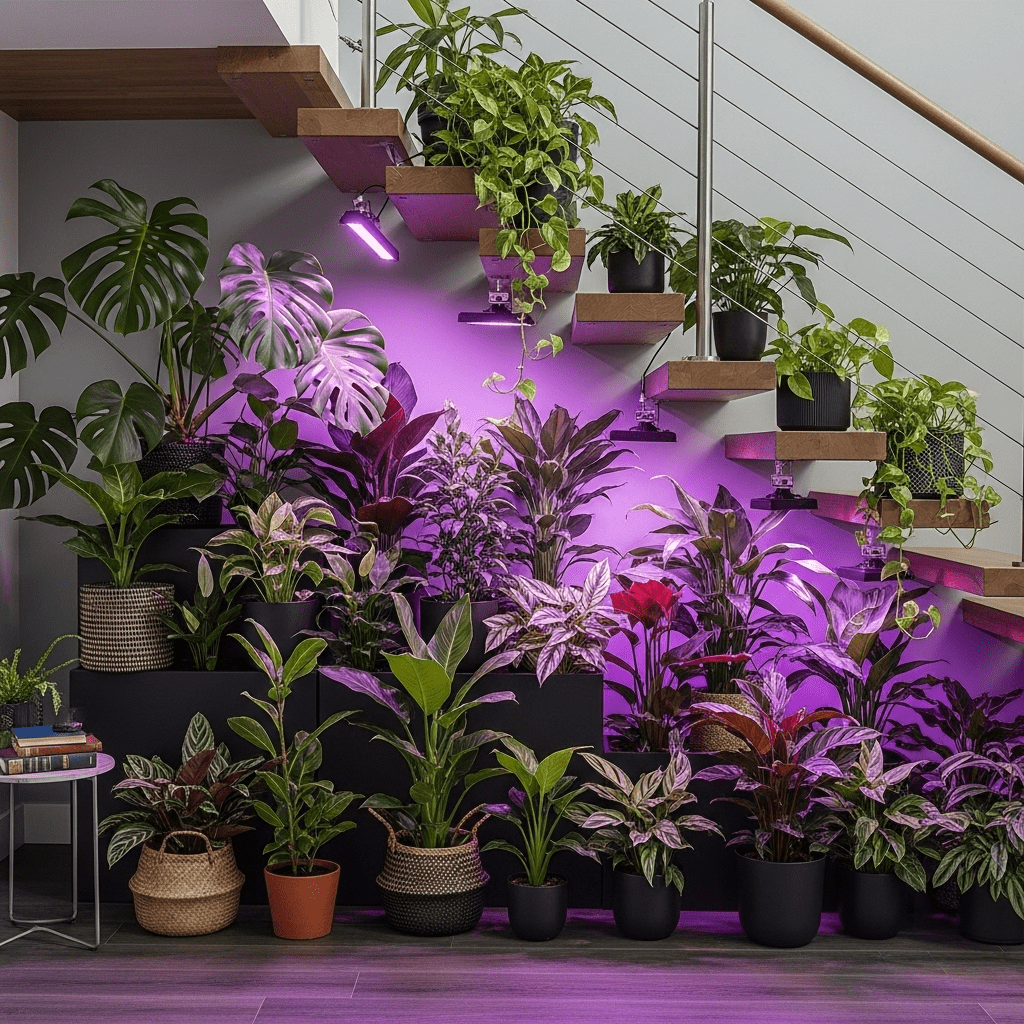 Utilizing the often-wasted space beneath a staircase to create a tiered garden with grow lights, turning a dark corner into a vibrant oasis.