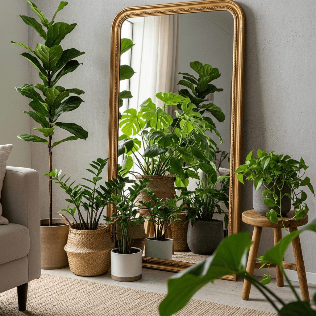 Placing a large mirror behind a group of plants to double their visual volume and reflect more light onto the leaves.