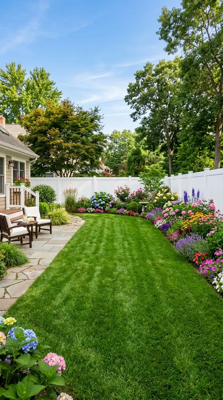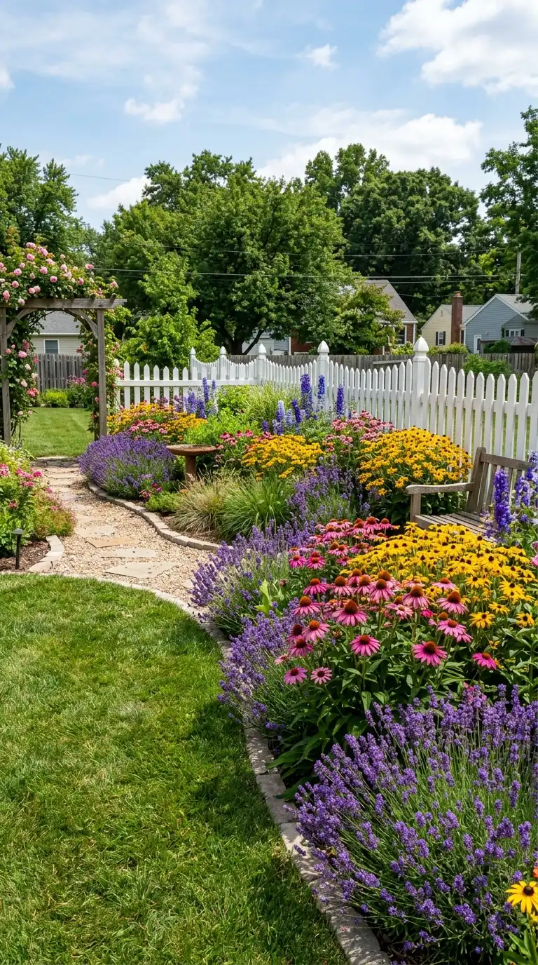 Define your yard’s edges with a colorful flower border. Plant perennials like lavender, coneflowers, black-eyed Susans, and salvia for season-long color. Add annuals for pops of brightness. A flower border softens the transition from lawn to fence and adds curb appeal.