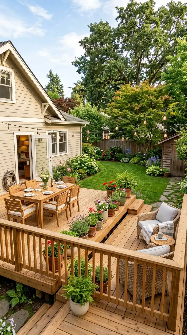 A deck adds usable square footage and connects your home to the yard. Use pressure-treated lumber or composite decking. A simple rectangular deck off the back door can hold a dining set and lounge chairs. Add stairs to the lawn for easy access.