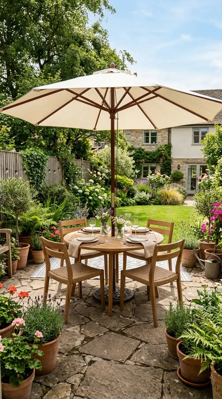 Designate a dedicated space for outdoor dining. Use a table and chairs that fit the scale of your yard—a bistro set for two, a round table for four, or a farm table for larger gatherings. Add an umbrella for shade, and place the dining area near the kitchen for easy serving.