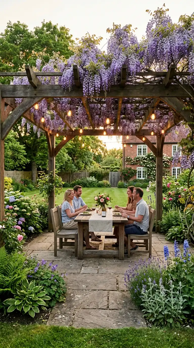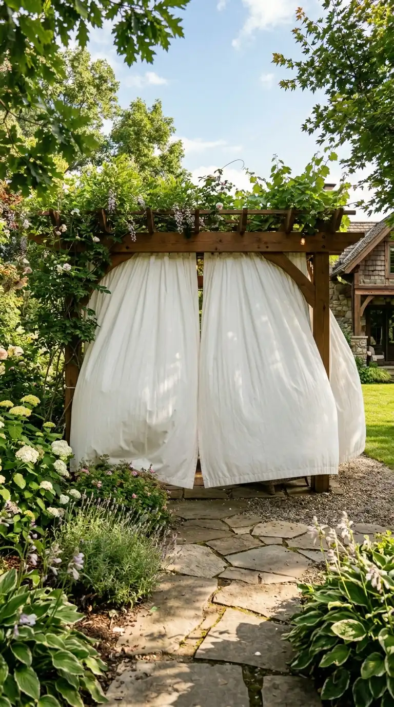 A pergola creates a defined outdoor room and provides partial shade. Attach it to your house or place it freestanding over a seating or dining area. Add climbing vines like wisteria or jasmine for natural shade and fragrance. Hang string lights or a chandelier for evening ambiance.