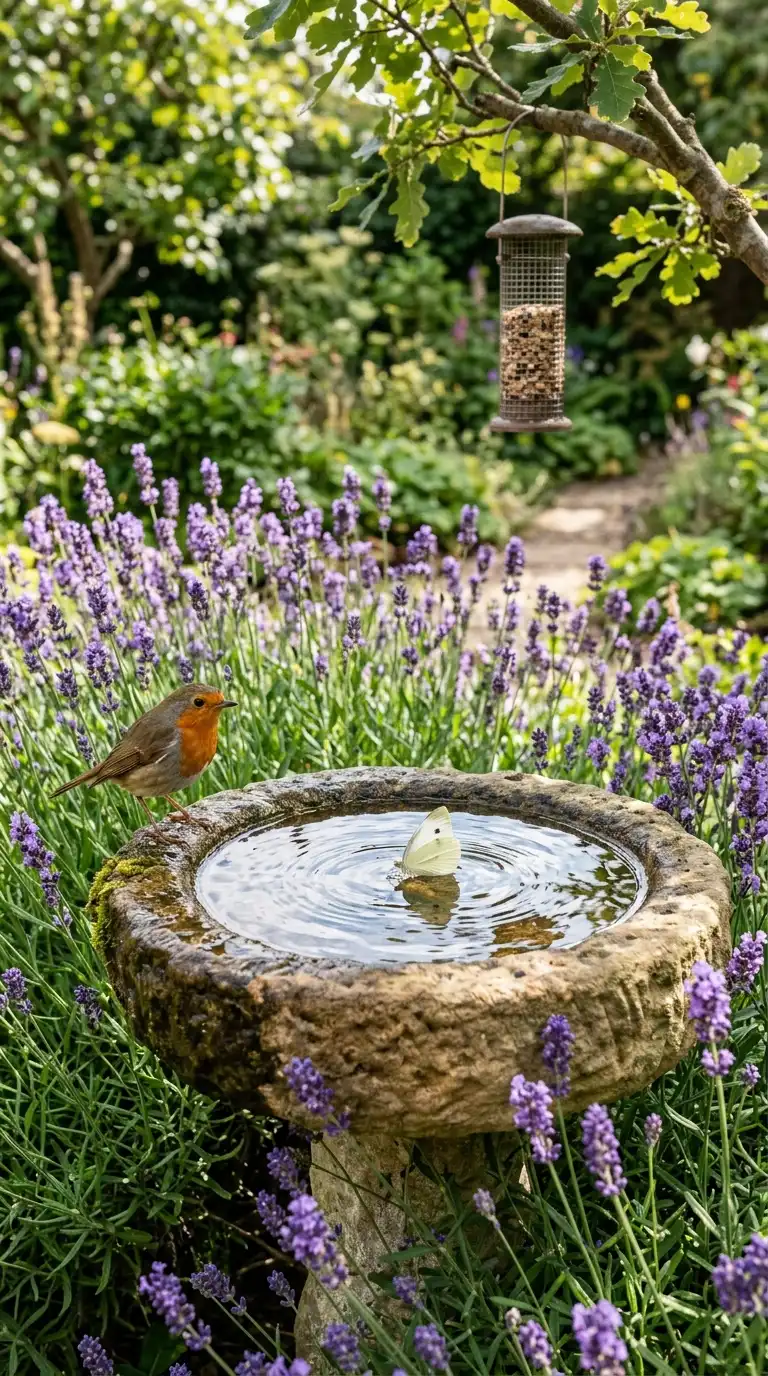 Invite birds to your yard with a stone birdbath and a feeder. Place them near a window or seating area where you can enjoy watching. Birds add life, movement, and song to your backyard.