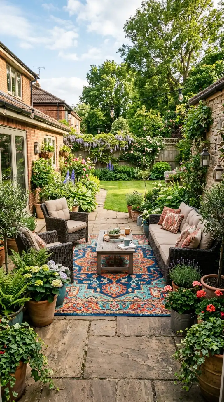 Design a comfortable lounge area for relaxation and conversation. Use weather-resistant sofas, armchairs, and a coffee table. Add cushions, pillows, and an outdoor rug. Position the lounge area near a fire pit or water feature for added ambiance.
