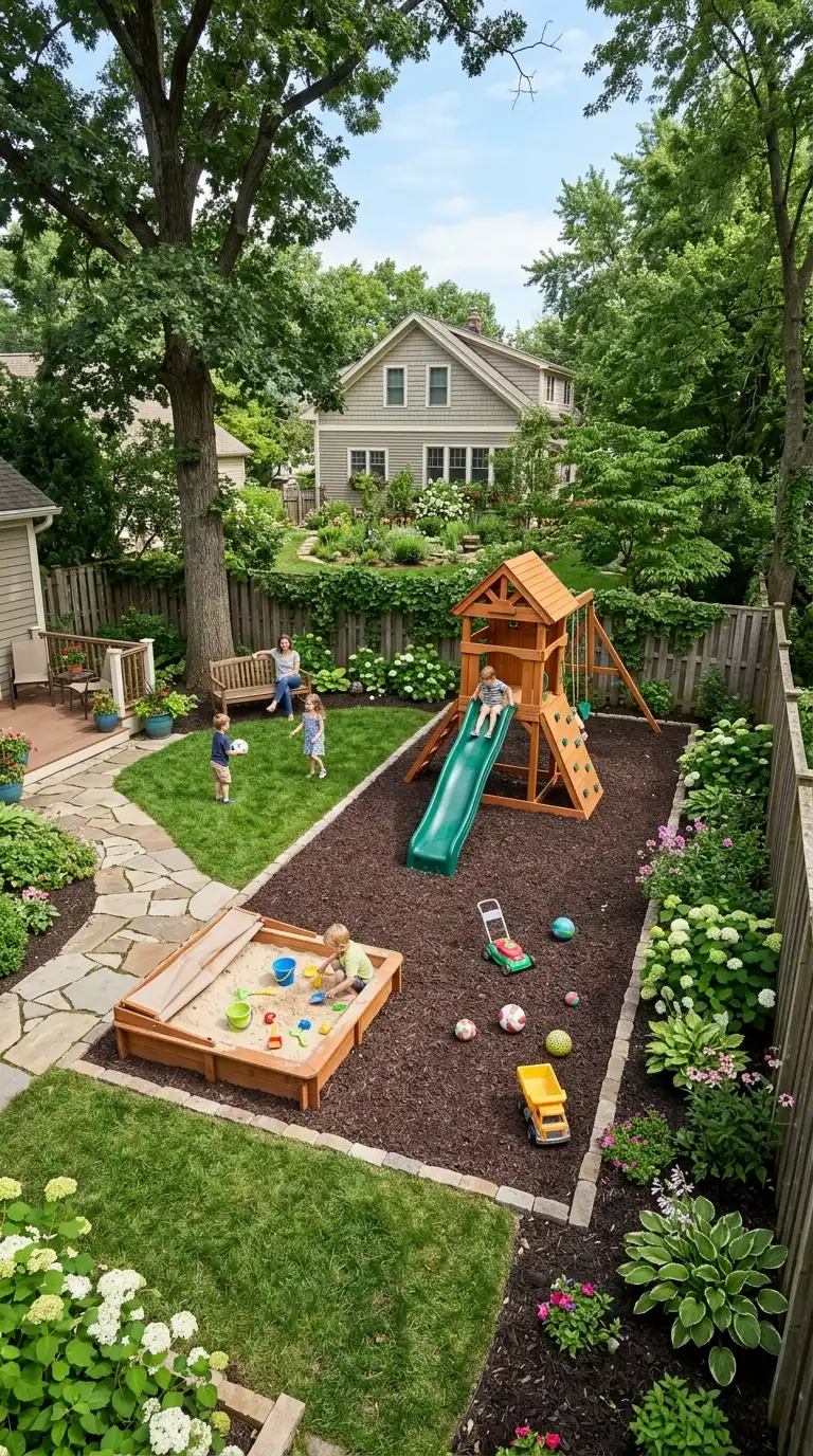Designate a zone for children’s play with a sandbox, small play structure, or a patch of lawn for games. Use soft surfacing like rubber mulch or wood chips for safety. Add a small bench for parents to supervise.