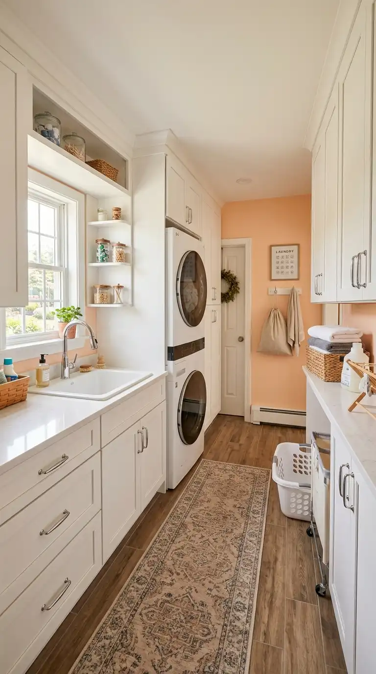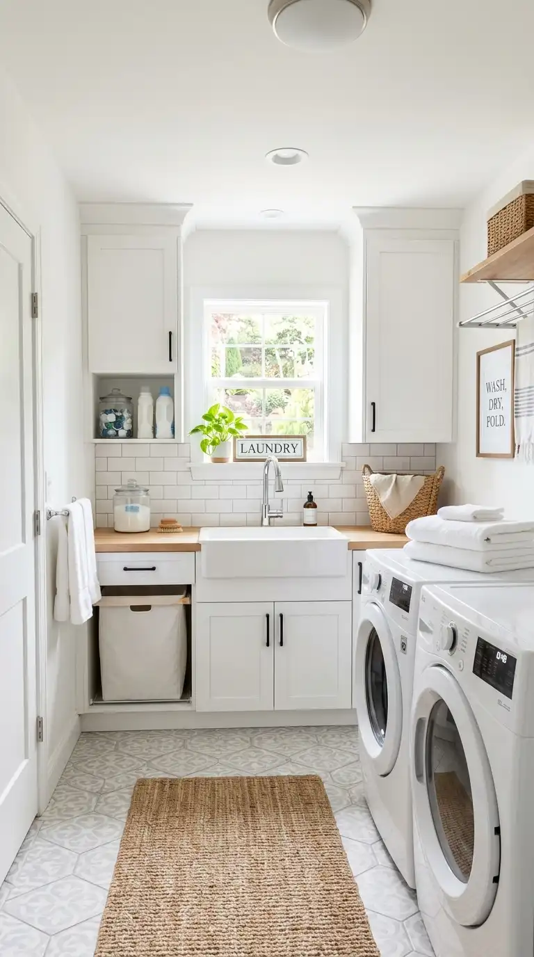 Warm white has subtle yellow or beige undertones. It is softer than pure white and works well in laundry rooms with little natural light. Pair with wood countertops and natural fiber rugs for a cozy feel.