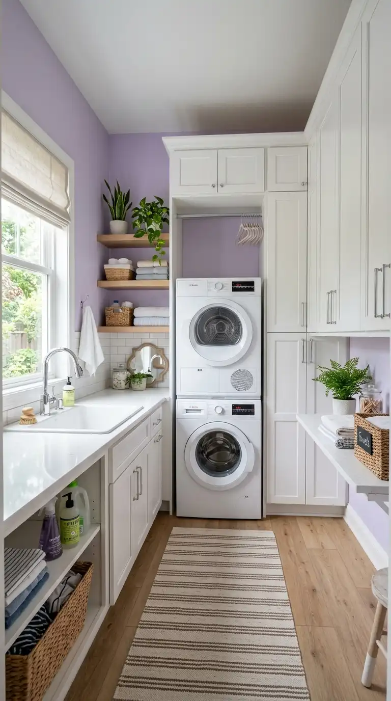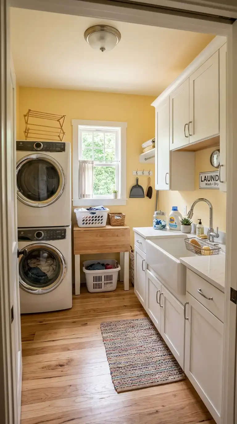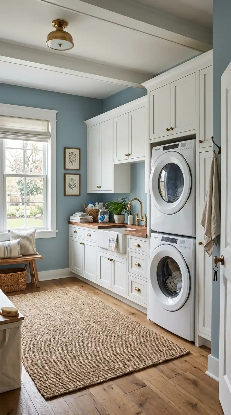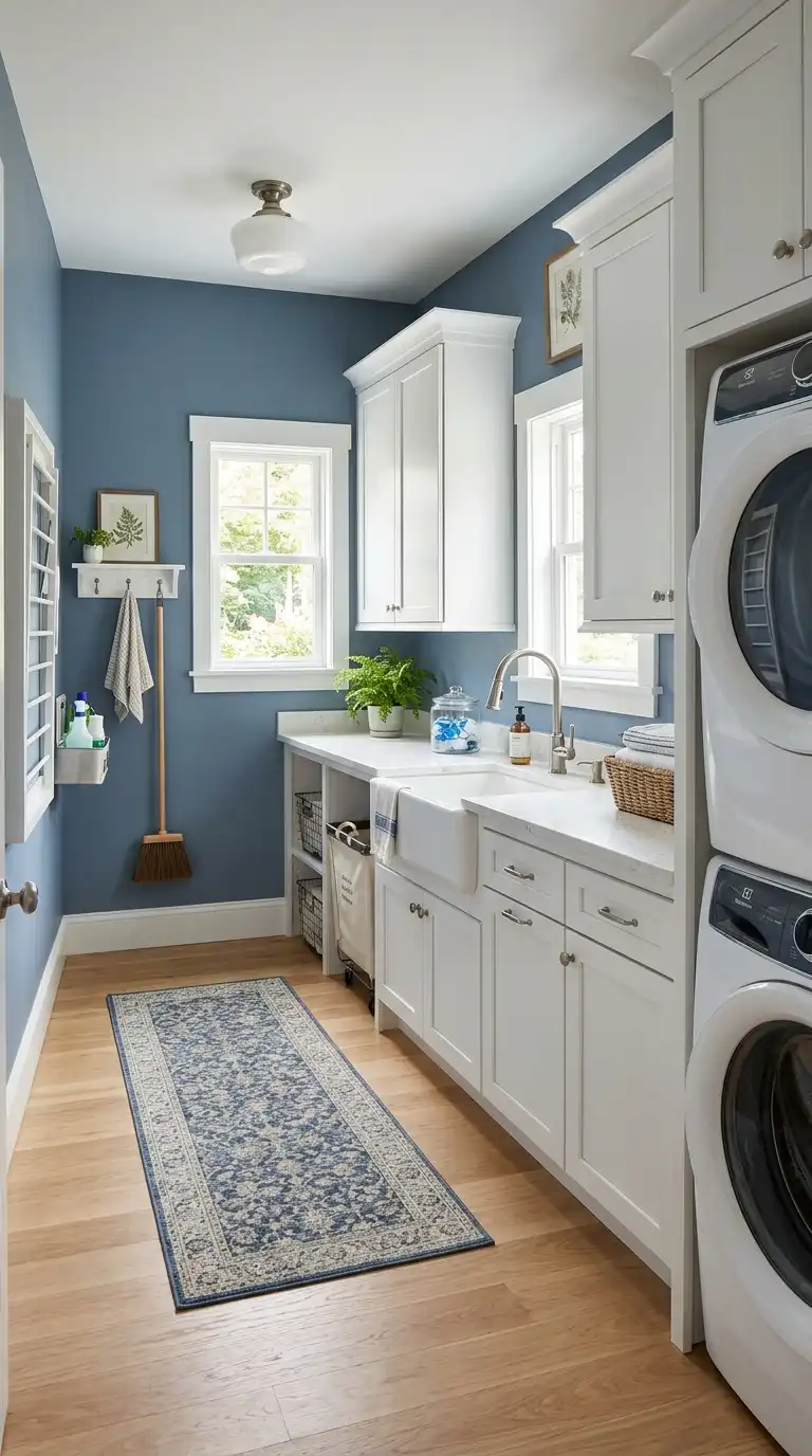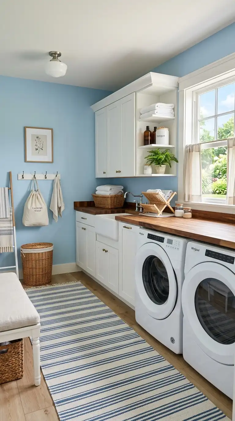 Soft sky blue evokes a calm, airy feeling. It is perfect for small laundry rooms because it reflects light and makes the space feel open. Pair with white cabinets and natural wood accents. Add a blue and white rug for a coastal touch.