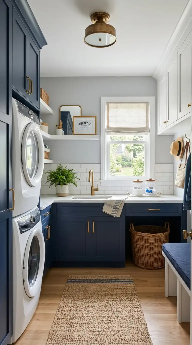 Navy blue adds drama and sophistication. Use it on lower cabinets or an accent wall. Pair with white upper cabinets, brass hardware, and a light countertop. Navy works best in medium to large laundry rooms with good lighting.