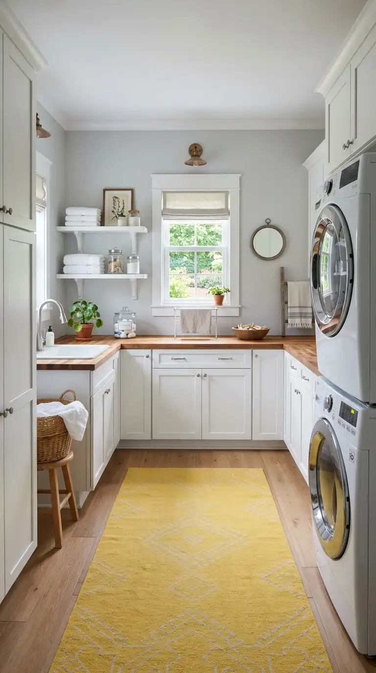 Pale gray is a versatile neutral that works in any laundry room. It is softer than white but still bright. Pair with white cabinets and a butcher block countertop. Add pops of color with accessories like a yellow rug or blue storage bins.