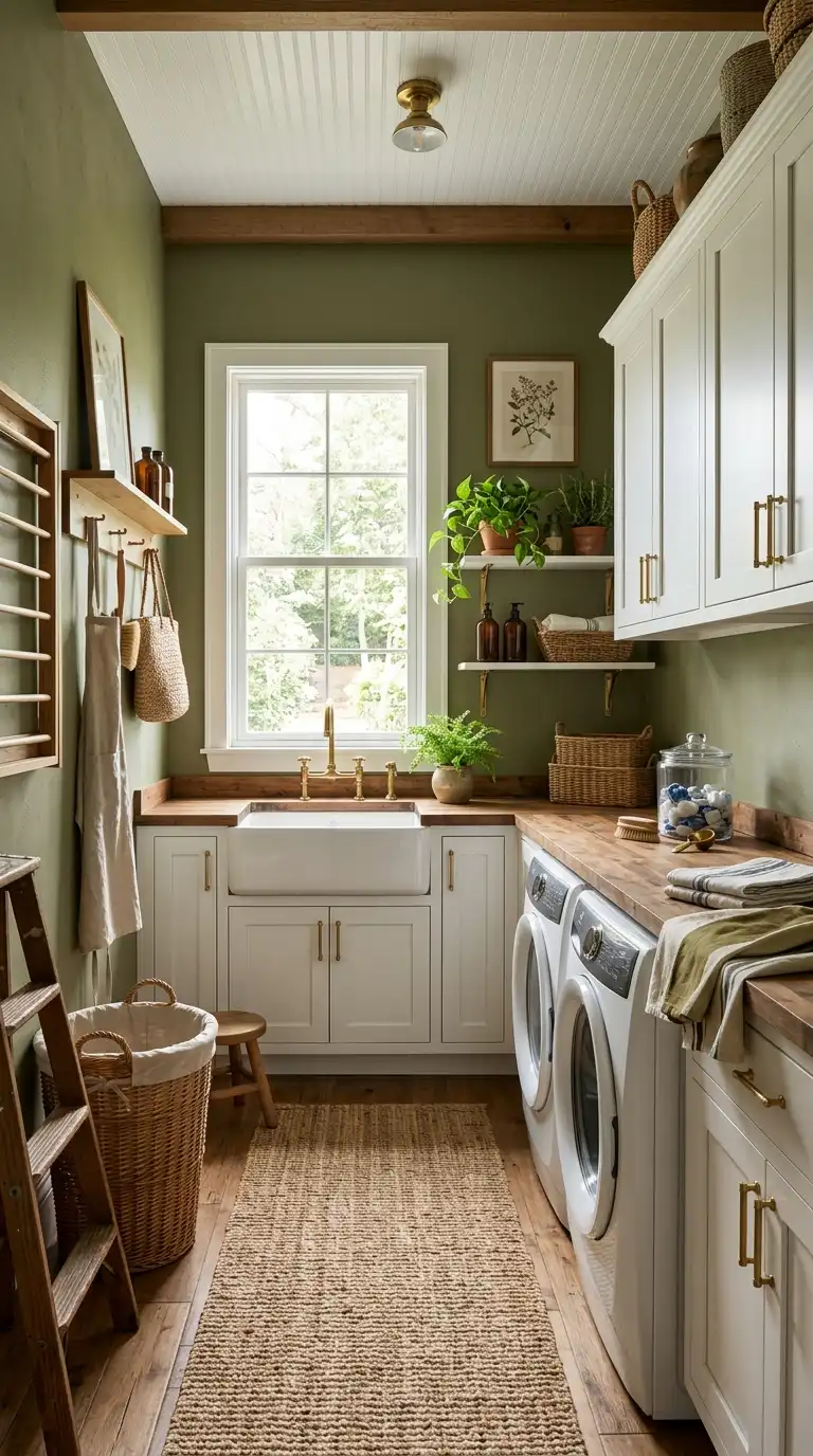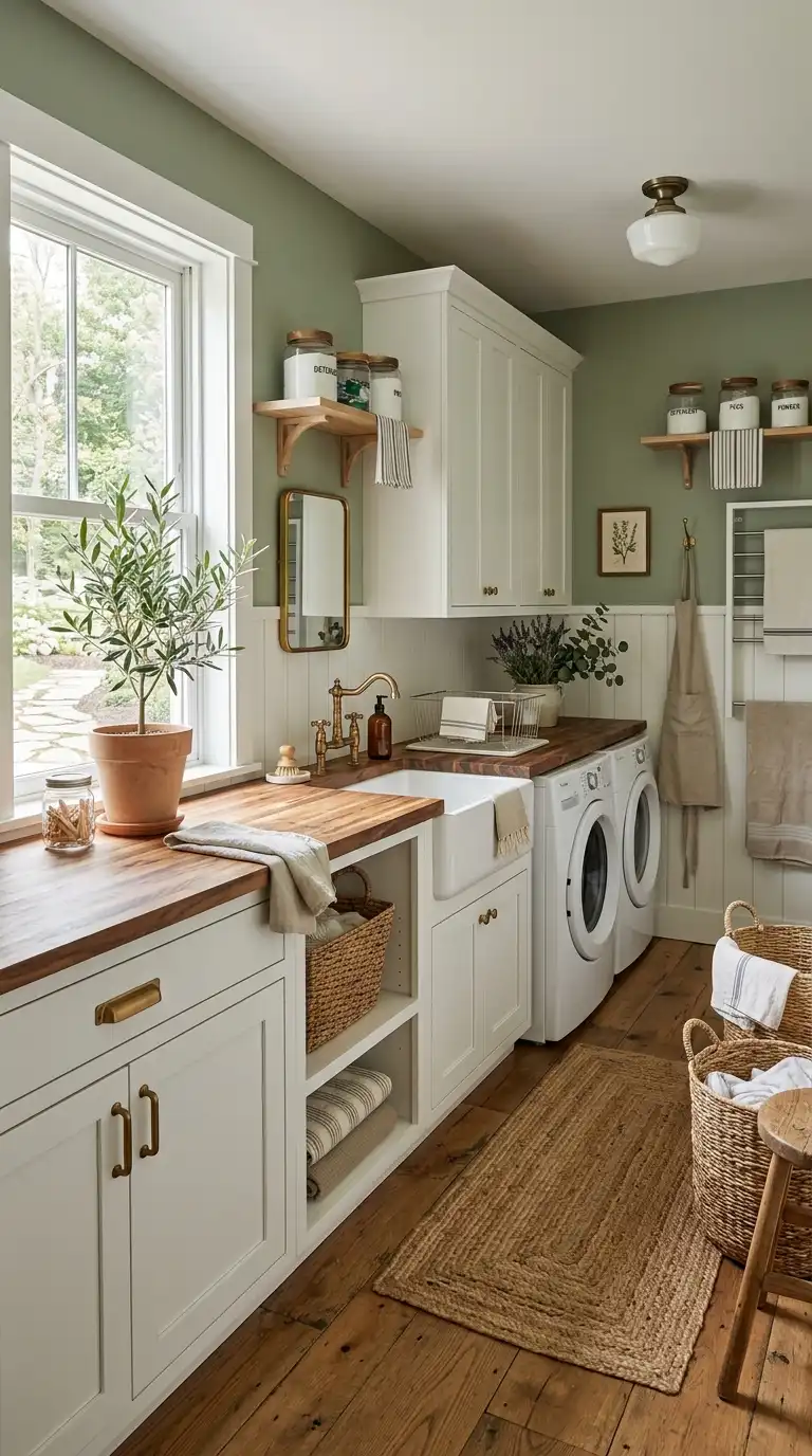 Olive green is an earthy, sophisticated color. It pairs beautifully with white cabinets, brass hardware, and natural wood. Use it on walls or lower cabinets. This color works well in farmhouse and traditional laundry rooms.