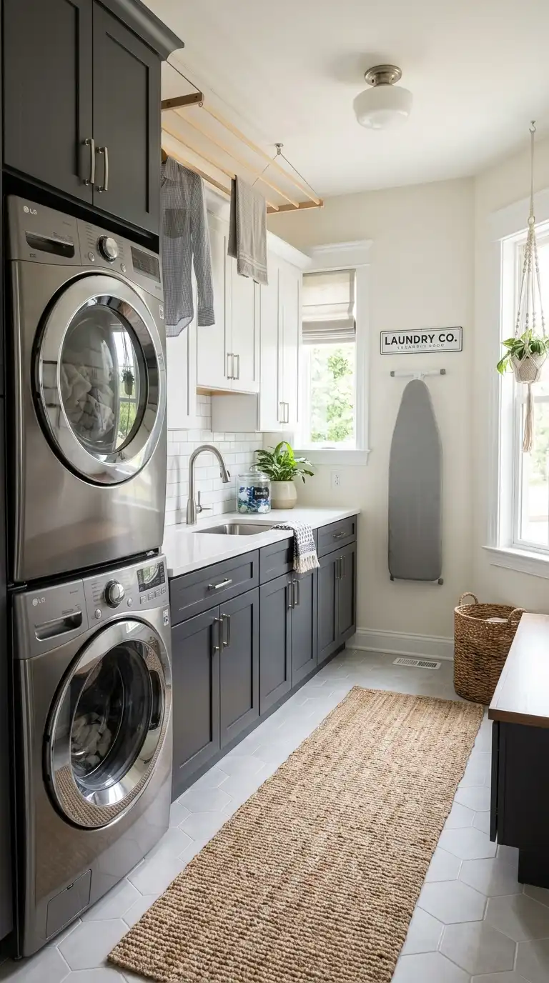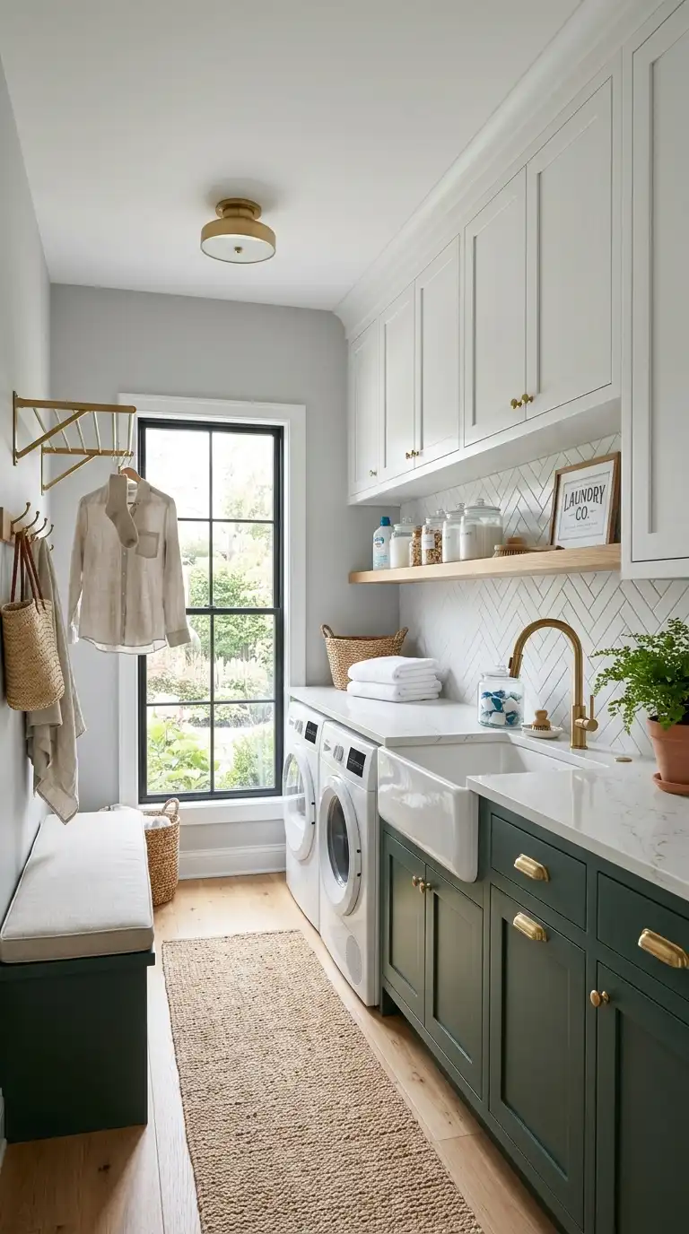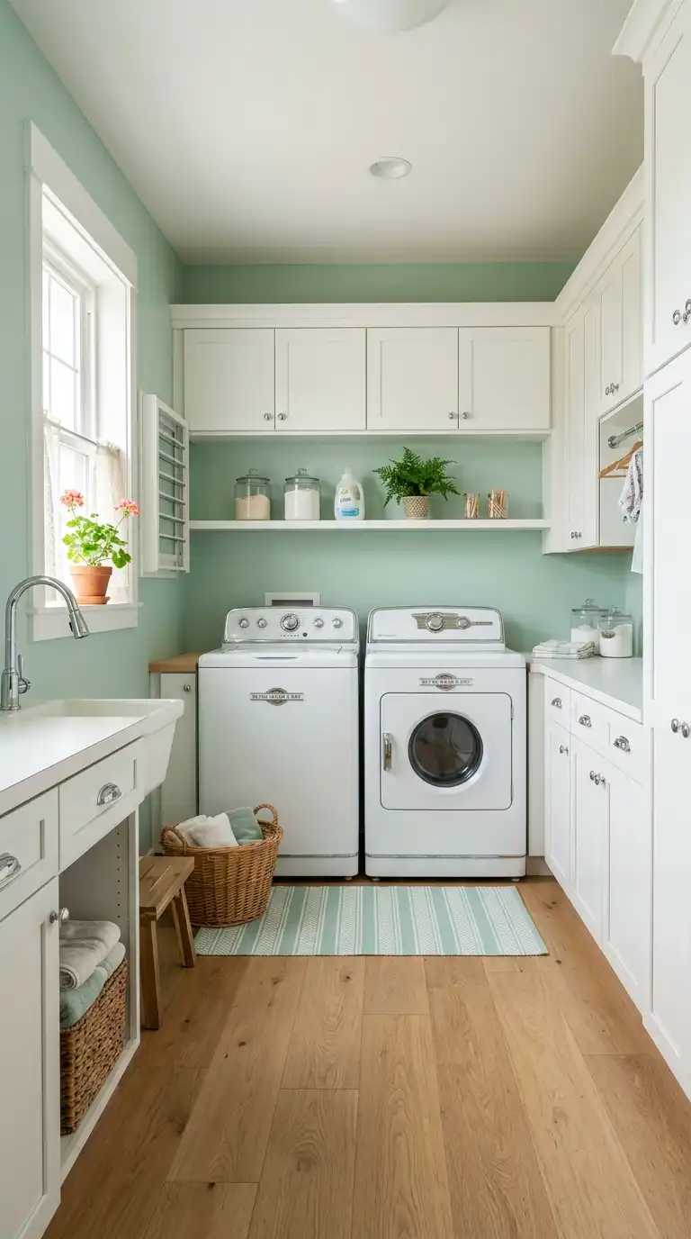 Sage green is a calming, earthy color that brings a touch of nature indoors. It pairs beautifully with white cabinets, natural wood, and brass hardware. Use it on walls or lower cabinets. It works well in farmhouse and cottage-style laundry rooms.