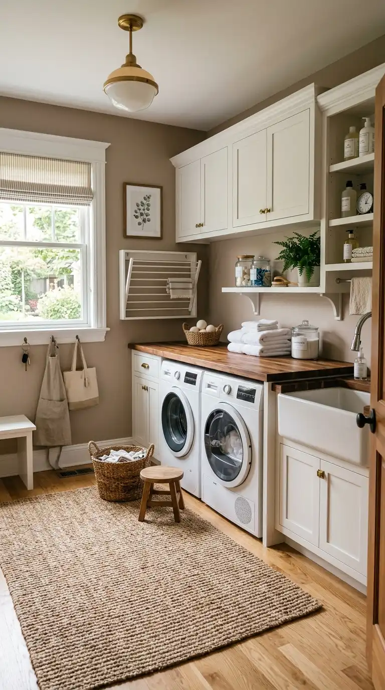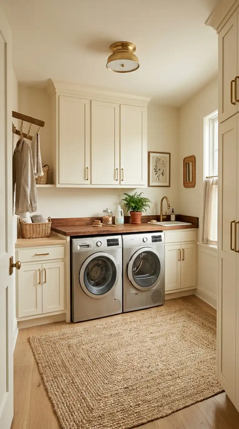 Beige or warm taupe is a cozy neutral that works well in laundry rooms with little natural light. It is warmer than gray and pairs well with white cabinets, wood countertops, and natural fiber rugs.