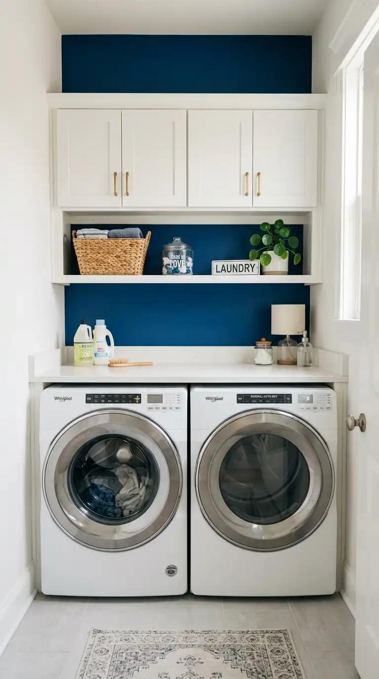 For a mostly white room, add a pop of color with a single blue accent wall. Paint the wall behind the washer and dryer in a bold blue like navy, cobalt, or sky blue. Keep the rest of the room white. This adds interest without overwhelming.
