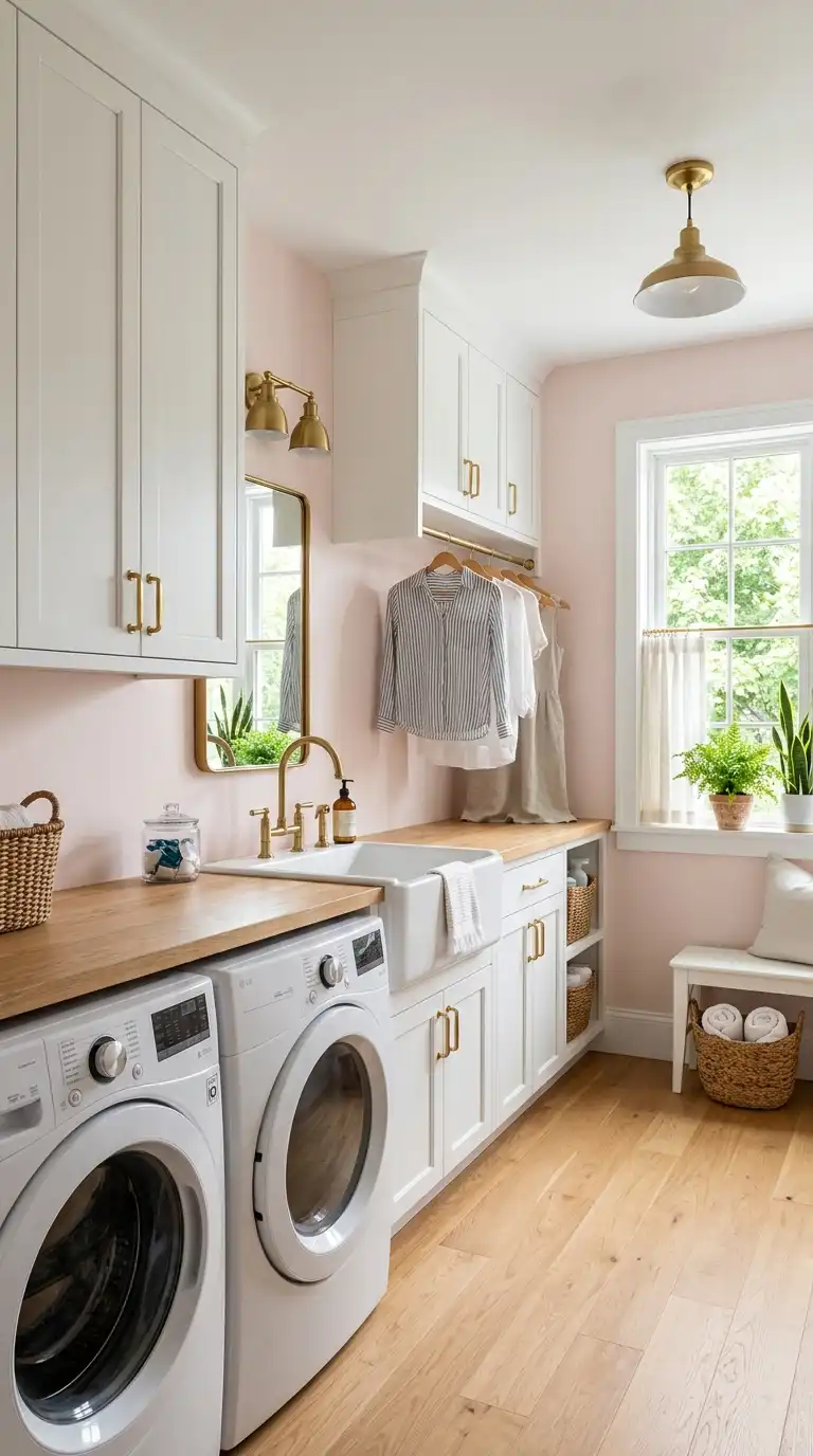 Pale pink or blush is soft, feminine, and cheerful. It pairs beautifully with white cabinets, brass hardware, and light wood floors. Use it on walls or on lower cabinets. This color works well in small, bright laundry rooms.