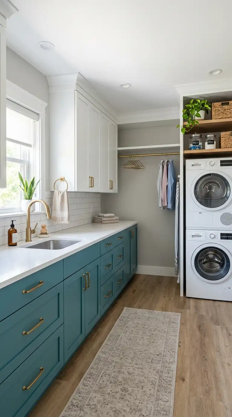 Teal is a bold, jewel-toned color that adds drama and energy. Use it on an accent wall or on lower cabinets. Pair with white upper cabinets, brass hardware, and a light countertop. Teal works best in larger laundry rooms with good lighting.