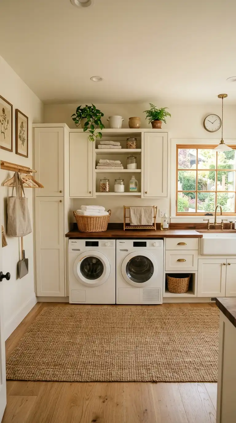 Cream is a warm, soft neutral that is less stark than white. It works well in laundry rooms with little natural light. Pair with wood countertops, natural fiber rugs, and brass hardware for a cozy, inviting feel.