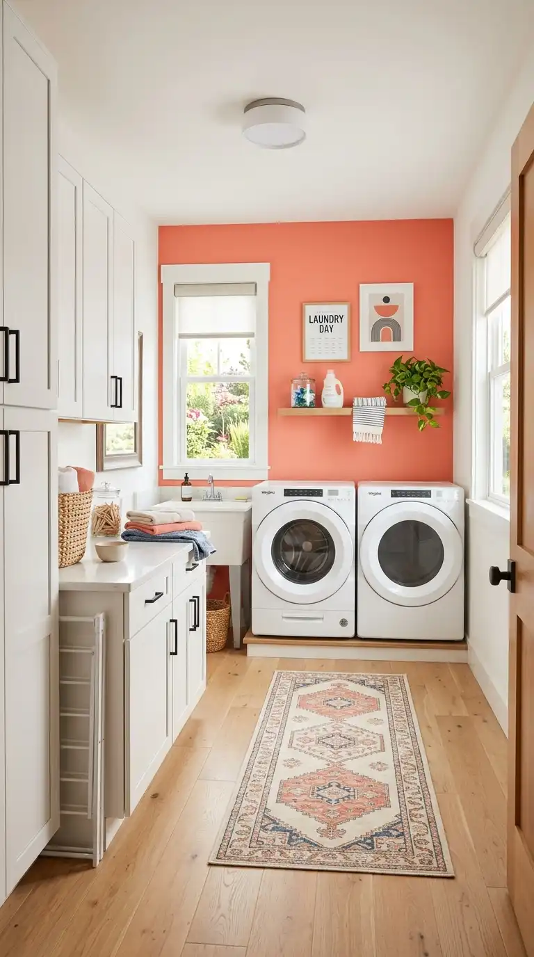 Coral is a vibrant, energetic color that adds a pop of fun to a laundry room. Use it on an accent wall or on a small piece of furniture. Pair with white cabinets and light wood floors. Keep the rest of the room neutral.