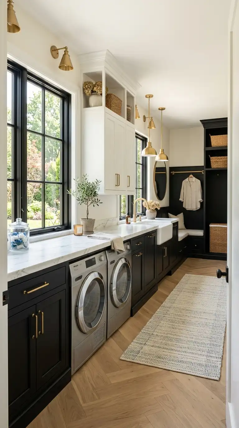 Black is a bold, dramatic choice for a laundry room. Use it on lower cabinets or as an accent wall. Pair with white upper cabinets, brass hardware, and a light countertop. Black works best in large, bright laundry rooms with plenty of natural light.