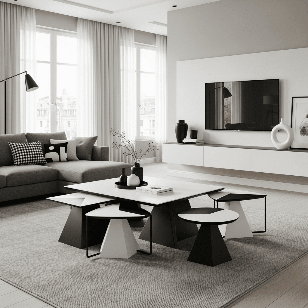 1. Two-Tone Geometric Set: A pair of contrasting tables (one black, one white) in different heights.